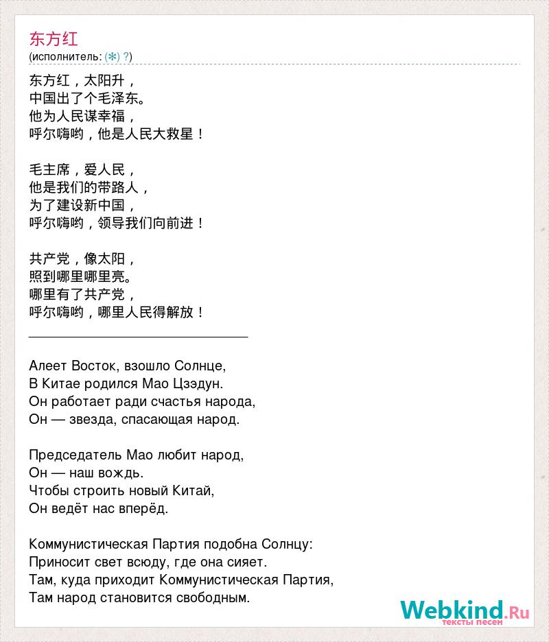东方红,太阳升, 中国出了个毛泽东。 他为人民谋幸福, 呼尔嗨哟,他是人民大救星! 毛主席,爱人民, 他是我们的带路人, 为了建设新中国, 呼尔嗨哟,领导我们向前进! 共产党,像太阳, 照到哪里哪里亮。 哪里有了共产党, 呼尔嗨哟,哪里人民得解放! _____________________________ Алеет Восток, взошло Солнце, В Китае родился Мао Цзэдун. Он работает ради счастья народа, Он — звезда, спасающая народ. Председатель Мао любит народ, Он — наш вождь. Чтобы строить новый Китай, Он ведёт нас вперёд. Коммунистическая Партия подобна Солнцу: Приносит свет всюду, где она сияет. Там, куда приходит Коммунистическая Партия, Там народ становится свободным.