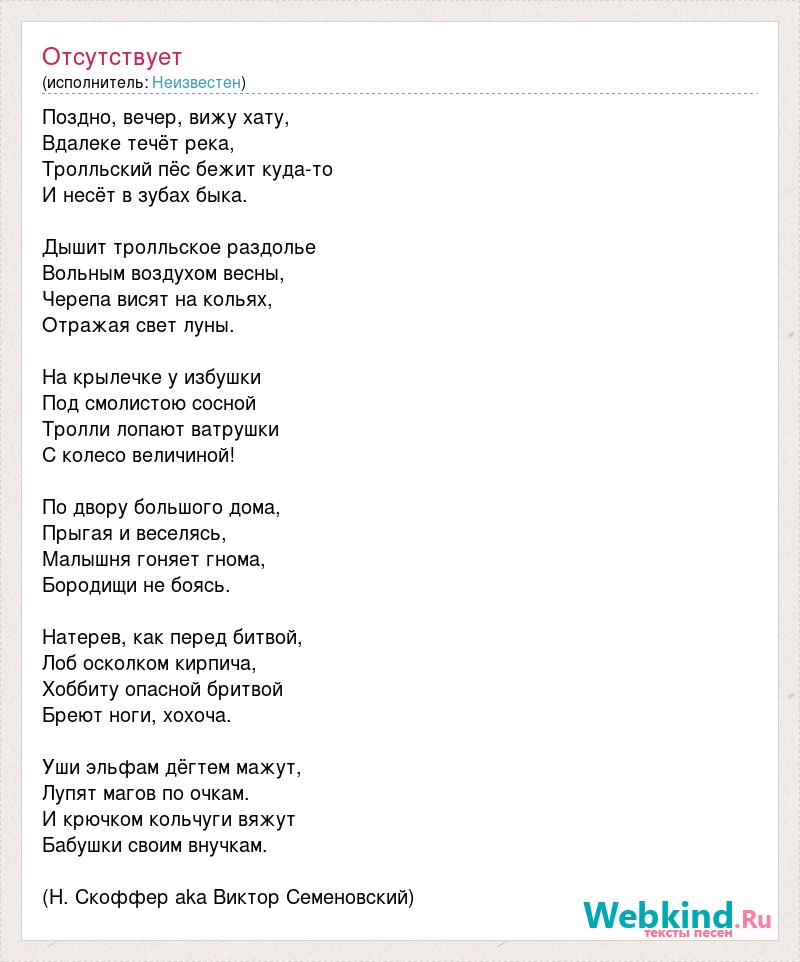 Поздно, вечер, вижу хату, Вдалеке течёт река, Тролльский пёс бежит куда-то И несёт в зубах быка. Дышит тролльское раздолье Вольным воздухом весны, Черепа висят на кольях, Отражая свет луны. На крылечке у избушки Под смолистою сосной Тролли лопают ватрушки С колесо величиной! По двору большого дома, Прыгая и веселясь, Малышня гоняет гнома, Бородищи не боясь. Натерев, как перед битвой, Лоб осколком кирпича, Хоббиту опасной бритвой Бреют ноги, хохоча. Уши эльфам дёгтем мажут, Лупят магов по очкам. И крючком кольчуги вяжут Бабушки своим внучкам. (Н. Скоффер aka Виктор Семеновский)