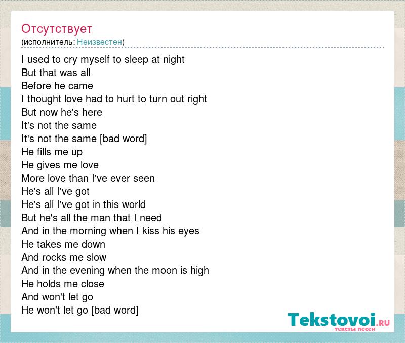 I used to cry myself to sleep at night But that was all Before he came I thought love had to hurt to turn out right But now he's here It's not the same It's not the same [bad word] He fills me up He gives me love More love than I've ever seen He's all I've got He's all I've got in this world But he's all the man that I need And in the morning when I kiss his eyes He takes me down And rocks me slow And in the evening when the moon is high He holds me close And won't let go He won't let go [bad word]