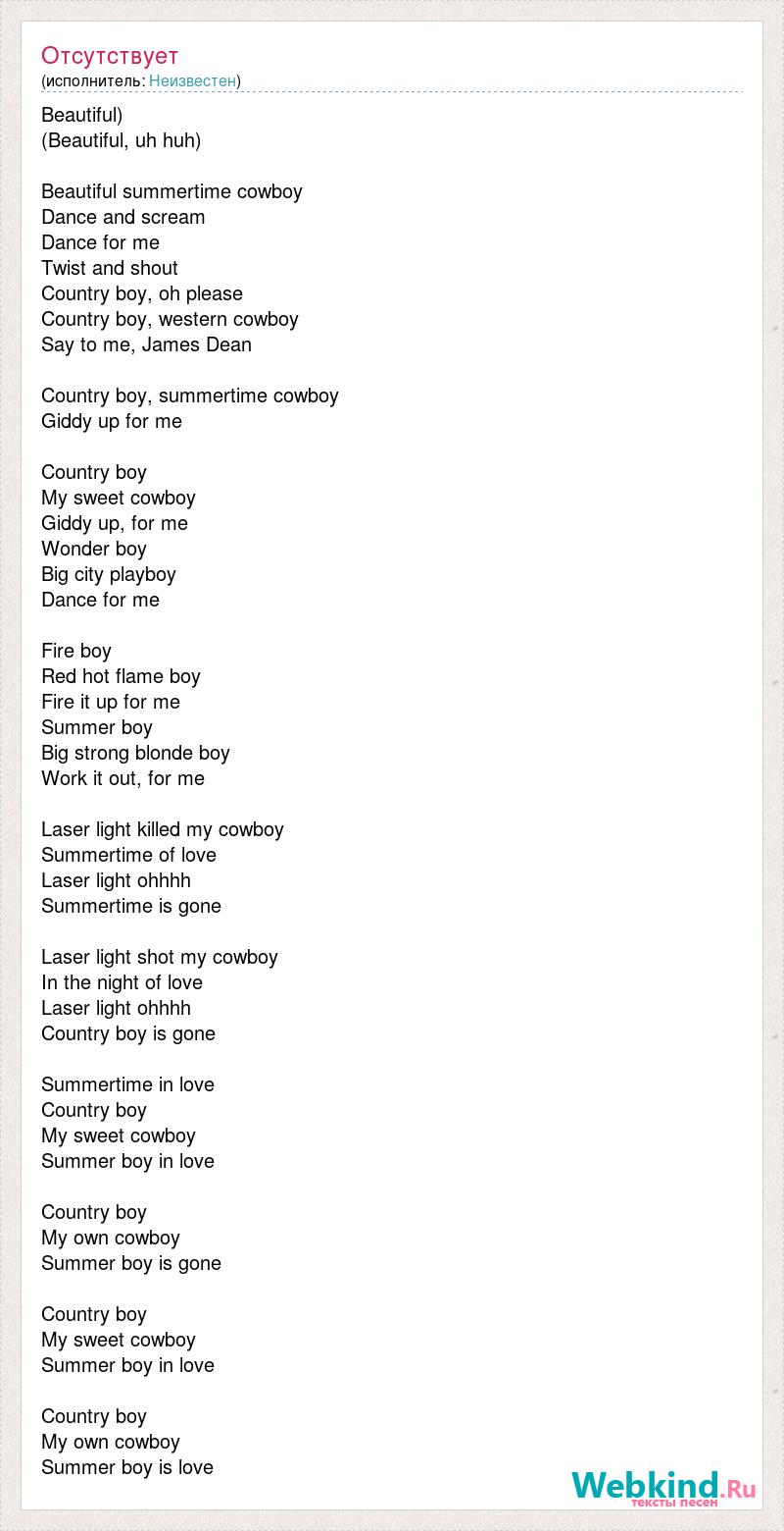 Beautiful) (Beautiful, uh huh) Beautiful summertime cowboy Dance and scream Dance for me Twist and shout Country boy, oh please Country boy, western cowboy Say to me, James Dean Country boy, summertime cowboy Giddy up for me Country boy My sweet cowboy Giddy up, for me Wonder boy Big city playboy Dance for me Fire boy Red hot flame boy Fire it up for me Summer boy Big strong blonde boy Work it out, for me Laser light killed my cowboy Summertime of love Laser light ohhhh Summertime is gone Laser light shot my cowboy In the night of love Laser light ohhhh Country boy is gone Summertime in love Country boy My sweet cowboy Summer boy in love Country boy My own cowboy Summer boy is gone Country boy My sweet cowboy Summer boy in love Country boy My own cowboy Summer boy is love