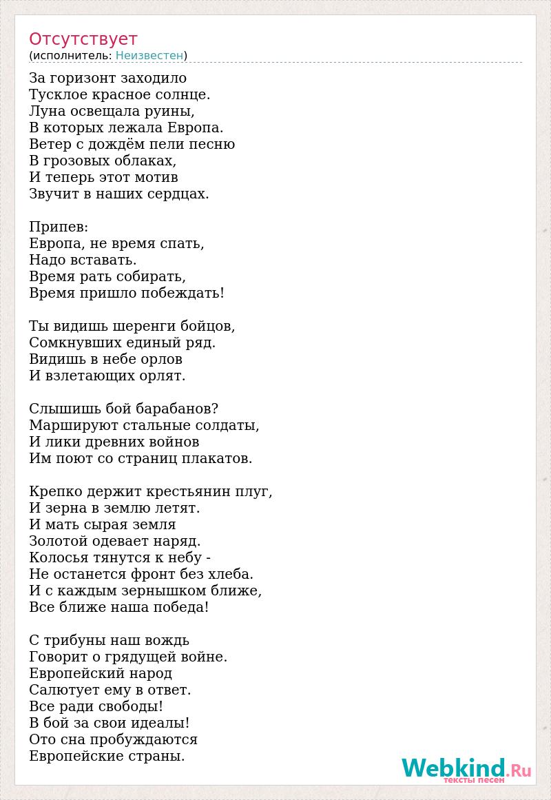 За горизонт заходило Тусклое красное солнце. Луна освещала руины, В которых лежала Европа. Ветер с дождём пели песню В грозовых облаках, И теперь этот мотив Звучит в наших сердцах. Припев: Европа, не время спать, Надо вставать. Время рать собирать, Время пришло побеждать! Ты видишь шеренги бойцов, Сомкнувших единый ряд. Видишь в небе орлов И взлетающих орлят. Слышишь бой барабанов? Маршируют стальные солдаты, И лики древних войнов Им поют со страниц плакатов. Крепко держит крестьянин плуг, И зерна в землю летят. И мать сырая земля Золотой одевает наряд. Колосья тянутся к небу - Не останется фронт без хлеба. И с каждым зернышком ближе, Все ближе наша победа! С трибуны наш вождь Говорит о грядущей войне. Европейский народ Салютует ему в ответ. Все ради свободы! В бой за свои идеалы! Ото сна пробуждаются Европейские страны.