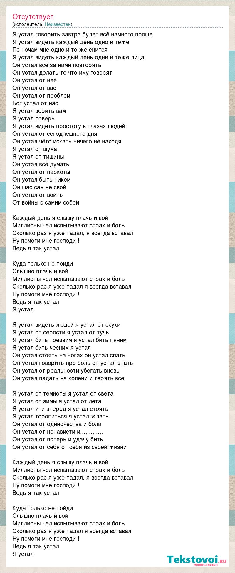 Я устал говорить завтра будет всё намного проще Я устал видеть каждый день одно и теже По ночам мне одно и то же снится Я устал видеть каждый день одни и теже лица Он устал всё за ними повторять Он устал делать то что иму говорят Он устал от неё Он устал от вас Он устал от проблем Бог устал от нас Я устал верить вам Я устал поверь Я устал видеть простоту в глазах людей Он устал от сегоднешнего дня Он устал чёто искать ничего не находя Я устал от шума Я устал от тишины Он устал всё думать Он устал от наркоты Он устал быть никем Он щас сам не свой Он устал от войны От войны с самим собой Каждый день я слышу плачь и вой Миллионы чел испытывают страх и боль Сколько раз я уже падал, я всегда вставал Ну помоги мне господи ! Ведь я так устал Куда только не пойди Слышно плачь и вой Миллионы чел испытывают страх и боль Сколько раз я уже падал я всегда вставал Ну помоги мне господи ! Ведь я так устал Я устал Я устал видеть людей я устал от скуки Я устал от серости я устал от тучь Я устал бить трезвим я устал бить пяним Я устал бить чесним я устал Он устал стоять на ногах он устал спать Он устал говорить про боль он устал знать Он устал от реальности убегать вновь Он устал падать на колени и терять все Я устал от темноты я устал от света Я устал от зимы я устал от лета Я устал ити вперед я устал стоять Я устал торопиться я устал ждать Он устал от одиночества и боли Он устал от ненависти и............. Он устал от потерь и удачу бить Он устал от себя от себя из своей жизни Каждый день я слышу плачь и вой Миллионы чел испытывают страх и боль Сколько раз я уже падал, я всегда вставал Ну помоги мне господи ! Ведь я так устал Куда только не пойди Слышно плачь и вой Миллионы чел испытывают страх и боль Сколько раз я уже падал я всегда вставал Ну помоги мне господи ! Ведь я так устал Я устал