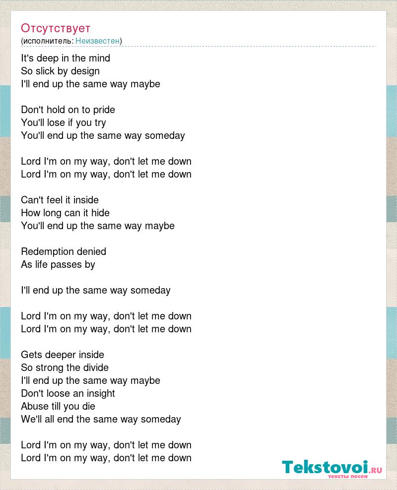 It's deep in the mind So slick by design I'll end up the same way maybe Don't hold on to pride You'll lose if you try You'll end up the same way someday Lord I'm on my way, don't let me down Lord I'm on my way, don't let me down Can't feel it inside How long can it hide You'll end up the same way maybe Redemption denied As life passes by I'll end up the same way someday Lord I'm on my way, don't let me down Lord I'm on my way, don't let me down Gets deeper inside So strong the divide I'll end up the same way maybe Don't loose an insight Abuse till you die We'll all end the same way someday Lord I'm on my way, don't let me down Lord I'm on my way, don't let me down
