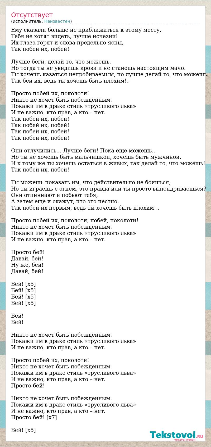 Ему сказали больше не приближаться к этому месту, Тебя не хотят видеть, лучше исчезни! Их глаза горят и слова предельно ясны, Так побей их, побей! Лучше беги, делай то, что можешь. Но тогда ты не увидишь крови и не станешь настоящим мачо. Ты хочешь казаться непробиваемым, но лучше делай то, что можешь. Так бей их, ведь ты хочешь быть плохим!.. Просто побей их, поколоти! Никто не хочет быть побежденным. Покажи им в драке стиль «трусливого льва» И не важно, кто прав, а кто – нет. Так побей их, побей! Так побей их, побей! Так побей их, побей! Так побей их, побей! Они отлучились... Лучше беги! Пока еще можешь... Но ты не хочешь быть мальчишкой, хочешь быть мужчиной. И к тому же ты хочешь остаться в живых, так делай то, что можешь! Так побей их, побей! Ты можешь показать им, что действительно не боишься, Но ты играешь с огнем, это правда или ты просто выпендриваешься? Они отпиннают и побьют тебя, А затем еще и скажут, что это честно. Так побей их первым, ведь ты хочешь быть плохим!.. Просто побей их, поколоти, побей, поколоти! Никто не хочет быть побежденным. Покажи им в драке стиль «трусливого льва» И не важно, кто прав, а кто – нет. Просто бей! Давай, бей! Ну же, бей! Давай, бей! Бей! [х5] Бей! [х5] Бей! [х5] Бей! [х5] Бей! Бей! Никто не хочет быть побежденным. Покажи им в драке стиль «трусливого льва» И не важно, кто прав, а кто – нет. Просто побей их, поколоти! Никто не хочет быть побежденным. Покажи им в драке стиль «трусливого льва» И не важно, кто прав, а кто – нет. Просто бей! Никто не хочет быть побежденным. Покажи им в драке стиль «трусливого льва» И не важно, кто прав, а кто – нет. Просто бей! [х7] Бей! [х5]