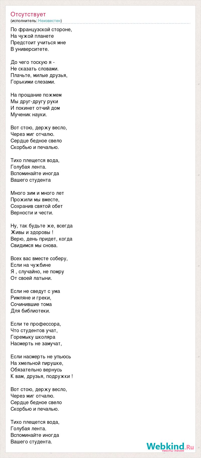 По французской стороне, На чужой планете Предстоит учиться мне В университете. До чего тоскую я - Не сказать словами. Плачьте, милые друзья, Горькими слезами. На прощание пожмем Мы друг-другу руки И покинет отчий дом Мученик науки. Вот стою, держу весло, Через миг отчалю. Сердце бедное свело Скорбью и печалью. Тихо плещется вода, Голубая лента. Вспоминайте иногда Вашего студента Много зим и много лет Прожили мы вместе, Сохранив святой обет Верности и чести. Ну, так будьте же, всегда Живы и здоровы ! Верю, день придет, когда Свидимся мы снова. Всех вас вместе соберу, Если на чужбине Я , случайно, не помру От своей латыни. Если не сведут с ума Римляне и греки, Сочинившие тома Для библиотеки. Если те профессора, Что студентов учат, Горемыку школяра Насмерть не замучат, Если насмерть не упьюсь На хмельной пирушке, Обязательно вернусь К вам, друзья, подружки ! Вот стою, держу весло, Через миг отчалю. Сердце бедное свело Скорбью и печалью. Тихо плещется вода, Голубая лента. Вспоминайте иногда Вашего студента.