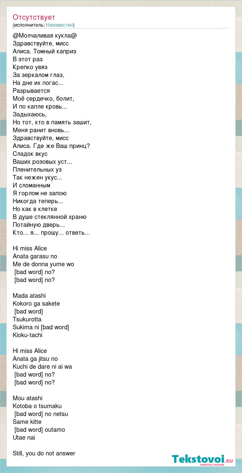 @Молчаливая кукла@ Здравствуйте, мисс Алиса. Томный каприз В этот раз Крепко увяз За зеркалом глаз, На дне их погас... Разрывается Моё сердечко, болит, И по капле кровь... Задыхаюсь, Но тот, кто в память зашит, Меня ранит вновь... Здравствуйте, мисс Алиса. Где же Ваш принц? Сладок вкус Ваших розовых уст... Пленительных уз Так нежен укус... И сломанным Я горлом не запою Никогда теперь... Но как в клетке В душе стеклянной храню Потайную дверь... Кто... я... прошу... ответь... Hi miss Alice Anata garasu no Me de donna yume wo [bad word] no? [bad word] no? Mada atashi Kokoro ga sakete [bad word] Tsukurotta Sukima ni [bad word] Kioku-tachi Hi miss Alice Anata ga jitsu no Kuchi de dare ni ai wa [bad word] no? [bad word] no? Mou atashi Kotoba o tsumaku [bad word] no netsu Same kitte [bad word] outamo Utae nai Still, you do not answer