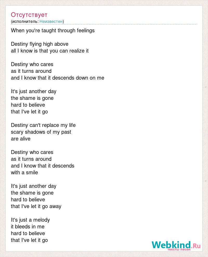 When you're taught through feelings Destiny flying high above all I know is that you can realize it Destiny who cares as it turns around and I know that it descends down on me It's just another day the shame is gone hard to believe that I've let it go Destiny can't replace my life scary shadows of my past are alive Destiny who cares as it turns around and I know that it descends with a smile It's just another day the shame is gone hard to believe that I've let it go away It's just a melody it bleeds in me hard to believe that I've let it go