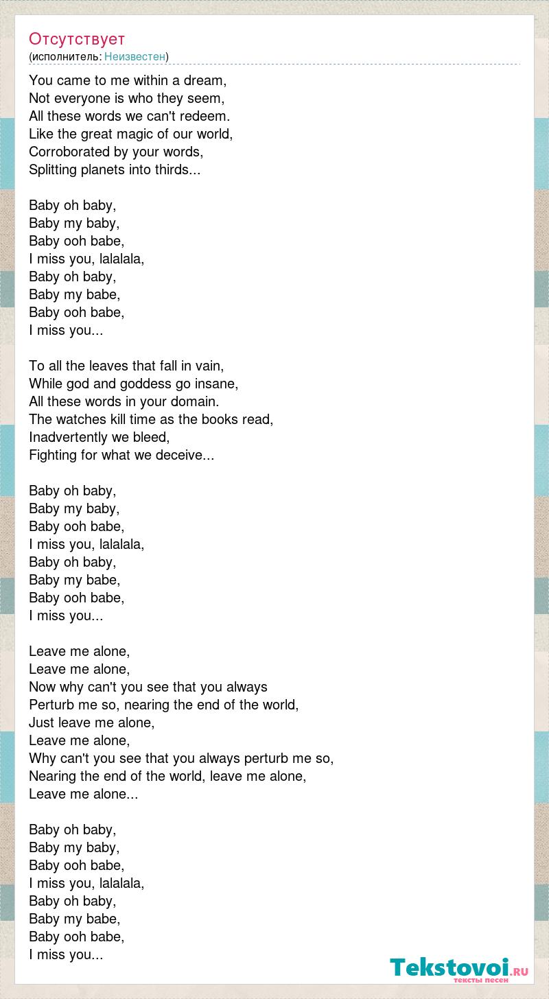 You came to me within a dream, Not everyone is who they seem, All these words we can't redeem. Like the great magic of our world, Corroborated by your words, Splitting planets into thirds... Baby oh baby, Baby my baby, Baby ooh babe, I miss you, lalalala, Baby oh baby, Baby my babe, Baby ooh babe, I miss you... To all the leaves that fall in vain, While god and goddess go insane, All these words in your domain. The watches kill time as the books read, Inadvertently we bleed, Fighting for what we deceive... Baby oh baby, Baby my baby, Baby ooh babe, I miss you, lalalala, Baby oh baby, Baby my babe, Baby ooh babe, I miss you... Leave me alone, Leave me alone, Now why can't you see that you always Perturb me so, nearing the end of the world, Just leave me alone, Leave me alone, Why can't you see that you always perturb me so, Nearing the end of the world, leave me alone, Leave me alone... Baby oh baby, Baby my baby, Baby ooh babe, I miss you, lalalala, Baby oh baby, Baby my babe, Baby ooh babe, I miss you...
