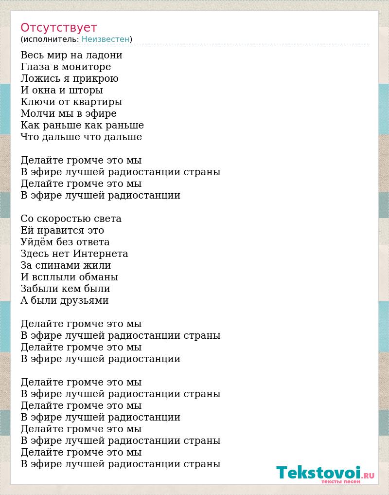 Весь мир на ладони Глаза в мониторе Ложись я прикрою И окна и шторы Ключи от квартиры Молчи мы в эфире Как раньше как раньше Что дальше что дальше Делайте громче это мы В эфире лучшей радиостанции страны Делайте громче это мы В эфире лучшей радиостанции Со скоростью света Ей нравится это Уйдём без ответа Здесь нет Интернета За спинами жили И всплыли обманы Забыли кем были А были друзьями Делайте громче это мы В эфире лучшей радиостанции страны Делайте громче это мы В эфире лучшей радиостанции Делайте громче это мы В эфире лучшей радиостанции страны Делайте громче это мы В эфире лучшей радиостанции Делайте громче это мы В эфире лучшей радиостанции страны Делайте громче это мы В эфире лучшей радиостанции страны