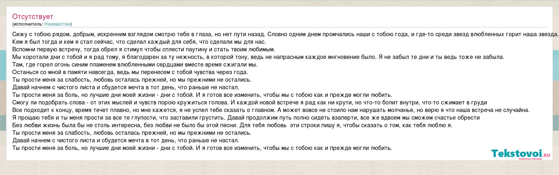 Сижу с тобою рядом, добрым, искренним взглядом смотрю тебе в глаза, но нет пути назад. Словно одним днем промчались наши с тобою года, и где-то среди звезд влюбленных горит наша звезда. Кем я был тогда и кем я стал сейчас, что сделал каждый для себя, что сделали мы для нас. Вспомни первую встречу, тогда обрел я стимул чтобы сплести паутину и стать твоим любимым. Мы коротали дни с тобой и я рад тому, я благодарен за ту нежность, в которой тону, ведь не напрасным каждое мнгновение было. Я не забыл те дни и ты ведь тоже не забыла. Там, где горел огонь синим пламенем влюбленными сердцами вместе время сжигали мы. Останься со мной в памяти навсегда, ведь мы перенесем с тобой чувства через года. Ты прости меня за слабость, любовь осталась прежней, но мы прежними не остались. Давай начнем с чистого листа и сбудется мечта в тот день, что раньше не настал. Ты прости меня за боль, но лучшие дни моей жизни - дни с тобой. И я готов все изменить, чтобы мы с тобою как и прежде могли любить. Смогу ли подобрать слова - от этих мыслей и чувств порою кружиться голова. И каждой новой встрече я рад как ни крути, но что-то болит внутри, что-то сжимает в груди Все подходит к концу, время течет плавно, но мне кажется, я не успел тебе сказать о главном. А может вовсе не стоило нам нарушать молчанье, но верю я что наша встреча не случайна. Я прощаю тебя и ты меня прости за все те глупости, что заставили грустить. Давай продолжим путь полно сидеть взаперти, все же вдвоем мы сможем счастье обрести Без любви жизнь была бы не столь интересна, без любви не было бы этой песни. Для тебя любовь эти строки пишу я, чтобы сказать о том, как тебя люблю я. Ты прости меня за слабость, любовь осталась прежней, но мы прежними не остались. Давай начнем с чистого листа и сбудется мечта в тот день, что раньше не настал. Ты прости меня за боль, но лучшие дни моей жизни - дни с тобой. И я готов все изменить, чтобы мы с тобою как и прежде могли любить.
