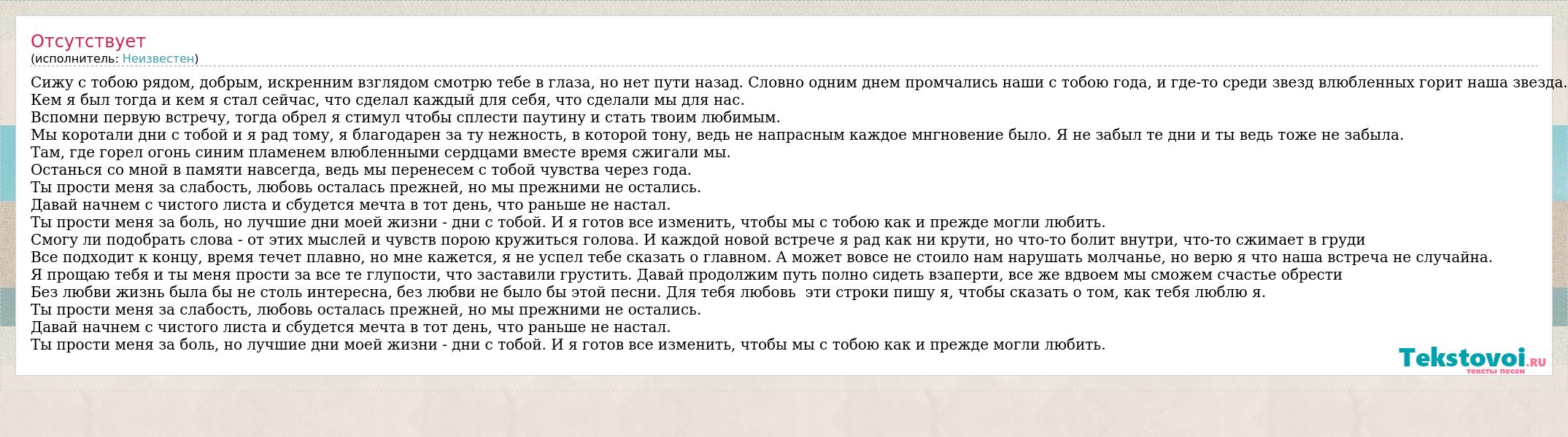 Сижу с тобою рядом, добрым, искренним взглядом смотрю тебе в глаза, но нет пути назад. Словно одним днем промчались наши с тобою года, и где-то среди звезд влюбленных горит наша звезда. Кем я был тогда и кем я стал сейчас, что сделал каждый для себя, что сделали мы для нас. Вспомни первую встречу, тогда обрел я стимул чтобы сплести паутину и стать твоим любимым. Мы коротали дни с тобой и я рад тому, я благодарен за ту нежность, в которой тону, ведь не напрасным каждое мнгновение было. Я не забыл те дни и ты ведь тоже не забыла. Там, где горел огонь синим пламенем влюбленными сердцами вместе время сжигали мы. Останься со мной в памяти навсегда, ведь мы перенесем с тобой чувства через года. Ты прости меня за слабость, любовь осталась прежней, но мы прежними не остались. Давай начнем с чистого листа и сбудется мечта в тот день, что раньше не настал. Ты прости меня за боль, но лучшие дни моей жизни - дни с тобой. И я готов все изменить, чтобы мы с тобою как и прежде могли любить. Смогу ли подобрать слова - от этих мыслей и чувств порою кружиться голова. И каждой новой встрече я рад как ни крути, но что-то болит внутри, что-то сжимает в груди Все подходит к концу, время течет плавно, но мне кажется, я не успел тебе сказать о главном. А может вовсе не стоило нам нарушать молчанье, но верю я что наша встреча не случайна. Я прощаю тебя и ты меня прости за все те глупости, что заставили грустить. Давай продолжим путь полно сидеть взаперти, все же вдвоем мы сможем счастье обрести Без любви жизнь была бы не столь интересна, без любви не было бы этой песни. Для тебя любовь эти строки пишу я, чтобы сказать о том, как тебя люблю я. Ты прости меня за слабость, любовь осталась прежней, но мы прежними не остались. Давай начнем с чистого листа и сбудется мечта в тот день, что раньше не настал. Ты прости меня за боль, но лучшие дни моей жизни - дни с тобой. И я готов все изменить, чтобы мы с тобою как и прежде могли любить.