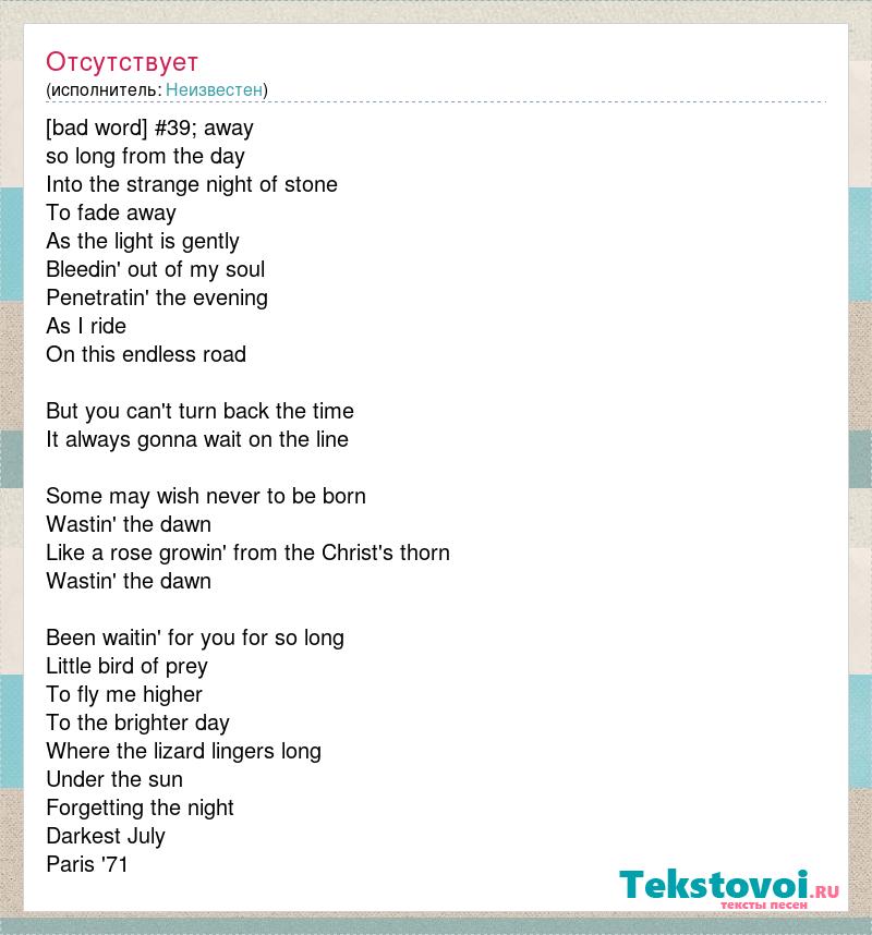 [bad word] #39; away so long from the day Into the strange night of stone To fade away As the light is gently Bleedin' out of my soul Penetratin' the evening As I ride On this endless road But you can't turn back the time It always gonna wait on the line Some may wish never to be born Wastin' the dawn Like a rose growin' from the Christ's thorn Wastin' the dawn Been waitin' for you for so long Little bird of prey To fly me higher To the brighter day Where the lizard lingers long Under the sun Forgetting the night Darkest July Paris '71
