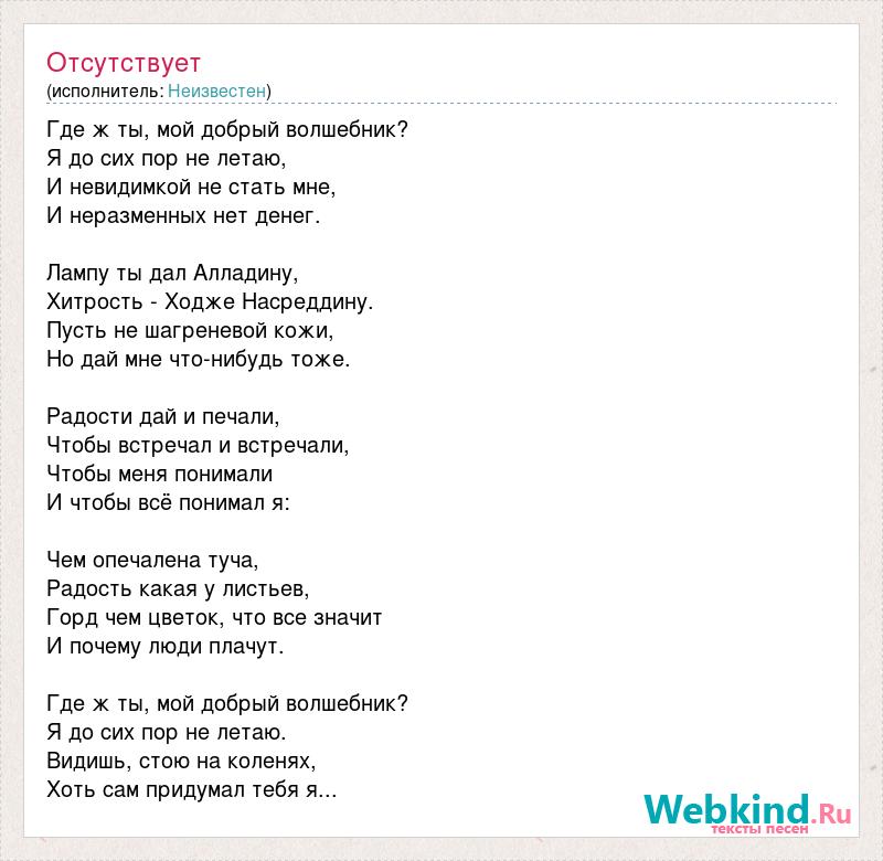 Где ж ты, мой добрый волшебник? Я до сих пор не летаю, И невидимкой не стать мне, И неразменных нет денег. Лампу ты дал Алладину, Хитрость - Ходже Насреддину. Пусть не шагреневой кожи, Но дай мне что-нибудь тоже. Радости дай и печали, Чтобы встречал и встречали, Чтобы меня понимали И чтобы всё понимал я: Чем опечалена туча, Радость какая у листьев, Горд чем цветок, что все значит И почему люди плачут. Где ж ты, мой добрый волшебник? Я до сих пор не летаю. Видишь, стою на коленях, Хоть сам придумал тебя я...