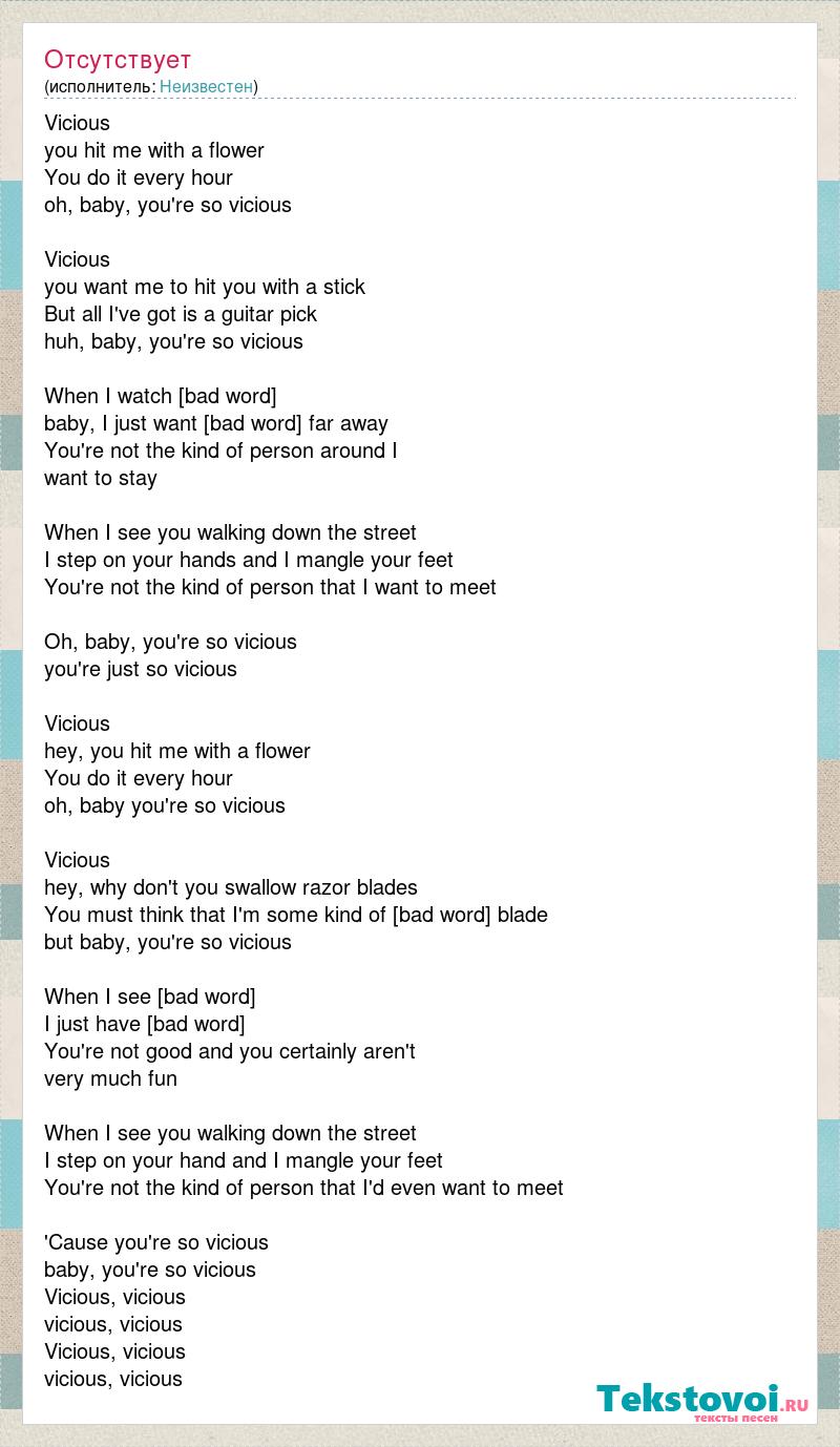 Vicious you hit me with a flower You do it every hour oh, baby, you're so vicious Vicious you want me to hit you with a stick But all I've got is a guitar pick huh, baby, you're so vicious When I watch [bad word] baby, I just want [bad word] far away You're not the kind of person around I want to stay When I see you walking down the street I step on your hands and I mangle your feet You're not the kind of person that I want to meet Oh, baby, you're so vicious you're just so vicious Vicious hey, you hit me with a flower You do it every hour oh, baby you're so vicious Vicious hey, why don't you swallow razor blades You must think that I'm some kind of [bad word] blade but baby, you're so vicious When I see [bad word] I just have [bad word] You're not good and you certainly aren't very much fun When I see you walking down the street I step on your hand and I mangle your feet You're not the kind of person that I'd even want to meet 'Cause you're so vicious baby, you're so vicious Vicious, vicious vicious, vicious Vicious, vicious vicious, vicious