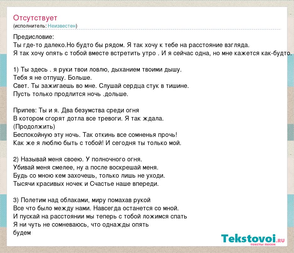 Предисловие: Ты где-то далеко.Но будто бы рядом. Я так хочу к тебе на расстояние взгляда. Я так хочу опять с тобой вместе встретить утро . И я сейчас одна, но мне кажется как-будто. 1) Ты здесь . я руки твои ловлю, дыханием твоими дышу. Тебя я не отпущу. Больше. Свет. Ты зажигаешь во мне. Слушай сердца стук в тишине. Пусть только продлится ночь .дольше. Припев: Ты и я. Два безумства среди огня В котором сгорят дотла все тревоги. Я так ждала. (Продолжить) Беспокойную эту ночь. Так откинь все сомненья прочь! Как же я люблю быть с тобой! И сегодня ты только мой. 2) Называй меня своею. У полночного огня. Убивай меня смелее, ну а после воскрешай меня. Будь со мною кем захочешь, только лишь не уходи. Тысячи красивых ночек и Счастье наше впереди. 3) Полетим над облаками, миру помахав рукой Все что было между нами. Навсегда останется со мной. И пускай на расстоянии мы теперь с тобой ложимся спать Я ни чуть не сомневаюсь, что однажды опять будем