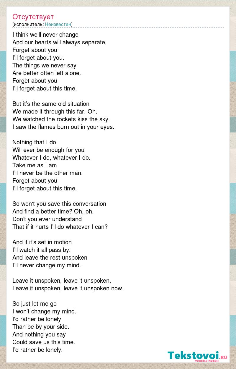 I think we'll never change And our hearts will always separate. Forget about you I’ll forget about you. The things we never say Are better often left alone. Forget about you I’ll forget about this time. But it’s the same old situation We made it through this far. Oh. We watched the rockets kiss the sky. I saw the flames burn out in your eyes. Nothing that I do Will ever be enough for you Whatever I do, whatever I do. Take me as I am I’ll never be the other man. Forget about you I’ll forget about this time. So won't you save this conversation And find a better time? Oh, oh. Don’t you ever understand That if it hurts I’ll do whatever I can? And if it’s set in motion I’ll watch it all pass by. And leave the rest unspoken I’ll never change my mind. Leave it unspoken, leave it unspoken, Leave it unspoken, leave it unspoken now. So just let me go I won’t change my mind. I'd rather be lonely Than be by your side. And nothing you say Could save us this time. I’d rather be lonely.