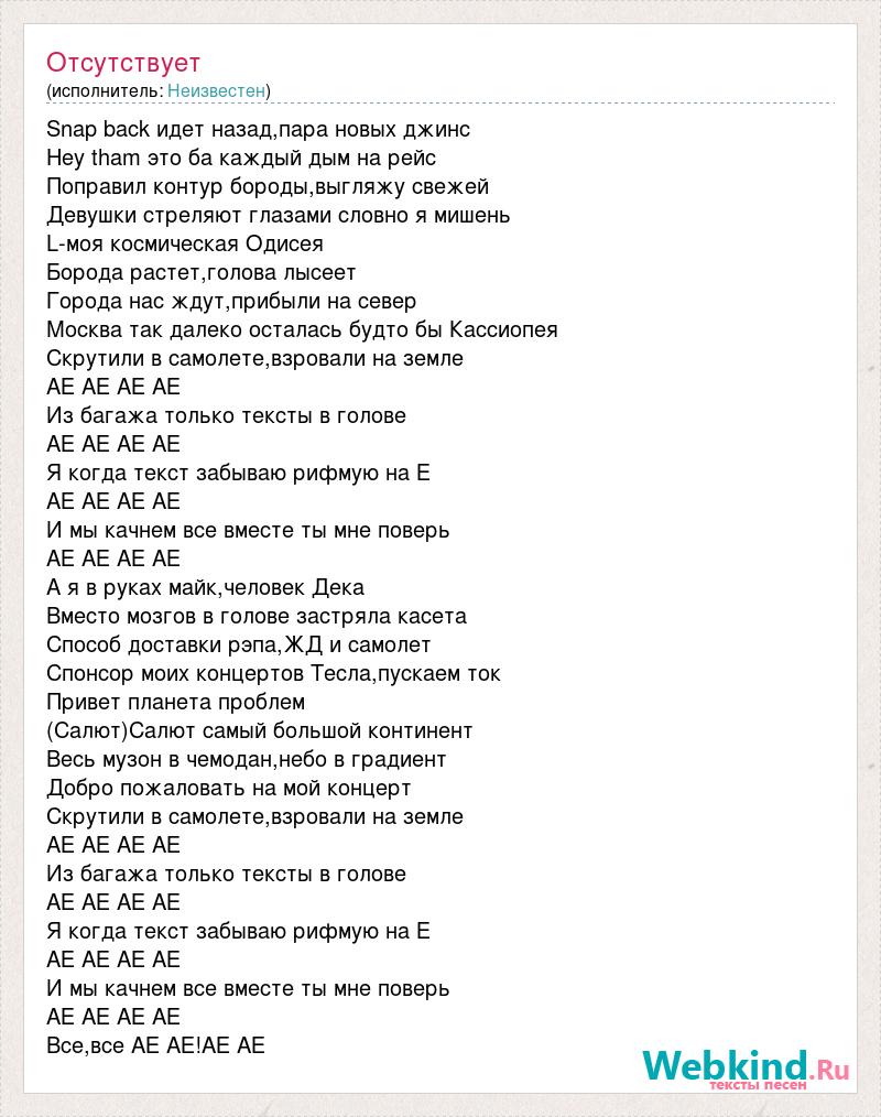 Snap back идет назад,пара новых джинс Hey tham это ба каждый дым на рейс Поправил контур бороды,выгляжу свежей Девушки стреляют глазами словно я мишень L-моя космическая Одисея Борода растет,голова лысеет Города нас ждут,прибыли на север Москва так далеко осталась будто бы Кассиопея Скрутили в самолете,взровали на земле АЕ АЕ АЕ АЕ Из багажа только тексты в голове АЕ АЕ АЕ АЕ Я когда текст забываю рифмую на Е АЕ АЕ АЕ АЕ И мы качнем все вместе ты мне поверь АЕ АЕ АЕ АЕ А я в руках майк,человек Дека Вместо мозгов в голове застряла касета Способ доставки рэпа,ЖД и самолет Спонсор моих концертов Тесла,пускаем ток Привет планета проблем (Салют)Салют самый большой континент Весь музон в чемодан,небо в градиент Добро пожаловать на мой концерт Скрутили в самолете,взровали на земле АЕ АЕ АЕ АЕ Из багажа только тексты в голове АЕ АЕ АЕ АЕ Я когда текст забываю рифмую на Е АЕ АЕ АЕ АЕ И мы качнем все вместе ты мне поверь АЕ АЕ АЕ АЕ Все,все АЕ АЕ!АЕ АЕ