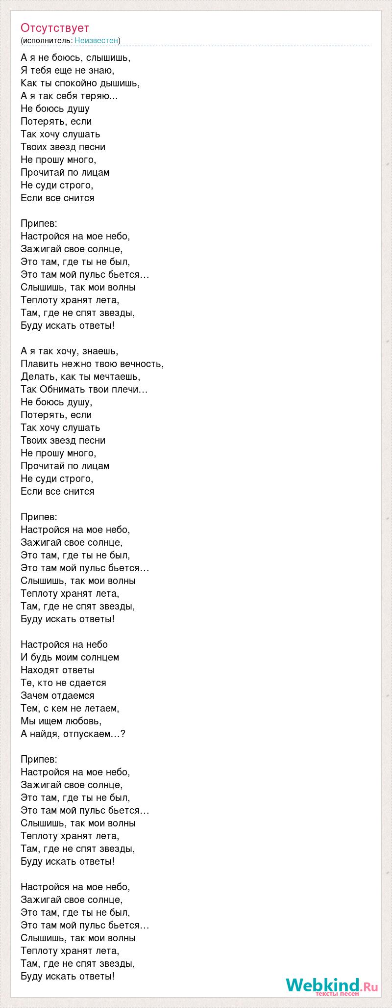 А я не боюсь, слышишь, Я тебя еще не знаю, Как ты спокойно дышишь, А я так себя теряю... Не боюсь душу Потерять, если Так хочу слушать Твоих звезд песни Не прошу много, Прочитай по лицам Не суди строго, Если все снится Припев: Настройся на мое небо, Зажигай свое солнце, Это там, где ты не был, Это там мой пульс бьется… Слышишь, так мои волны Теплоту хранят лета, Там, где не спят звезды, Буду искать ответы! А я так хочу, знаешь, Плавить нежно твою вечность, Делать, как ты мечтаешь, Так Обнимать твои плечи… Не боюсь душу, Потерять, если Так хочу слушать Твоих звезд песни Не прошу много, Прочитай по лицам Не суди строго, Если все снится Припев: Настройся на мое небо, Зажигай свое солнце, Это там, где ты не был, Это там мой пульс бьется… Слышишь, так мои волны Теплоту хранят лета, Там, где не спят звезды, Буду искать ответы! Настройся на небо И будь моим солнцем Находят ответы Те, кто не сдается Зачем отдаемся Тем, с кем не летаем, Мы ищем любовь, А найдя, отпускаем…? Припев: Настройся на мое небо, Зажигай свое солнце, Это там, где ты не был, Это там мой пульс бьется… Слышишь, так мои волны Теплоту хранят лета, Там, где не спят звезды, Буду искать ответы! Настройся на мое небо, Зажигай свое солнце, Это там, где ты не был, Это там мой пульс бьется… Слышишь, так мои волны Теплоту хранят лета, Там, где не спят звезды, Буду искать ответы!