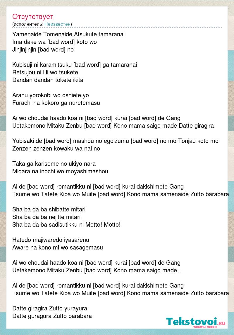 Yamenaide Tomenaide Atsukute tamaranai Ima dake wa [bad word] koto wo Jinjinjinjin [bad word] no Kubisuji ni karamitsuku [bad word] ga tamaranai Retsujou ni Hi wo tsukete Dandan dandan tokete ikitai Aranu yorokobi wo oshiete yo Furachi na kokoro ga nuretemasu Ai wo choudai haado koa ni [bad word] kurai [bad word] de Gang Uetakemono Mitaku Zenbu [bad word] Kono mama saigo made Datte giragira Yubisaki de [bad word] mashou no egoizumu [bad word] no mo Tonjau koto mo Zenzen zenzen kowaku wa nai no Taka ga karisome no ukiyo nara Midara na inochi wo moyashimashou Ai de [bad word] romantikku ni [bad word] kurai dakishimete Gang Tsume wo Tatete Kiba wo Muite [bad word] Kono mama samenaide Zutto barabara Sha ba da ba shibatte mitari Sha ba da ba nejitte mitari Sha ba da ba sadisutikku ni Motto! Motto! Hatedo majiwaredo iyasarenu Aware na kono mi wo sasagemasu Ai wo choudai haado koa ni [bad word] kurai [bad word] de Gang Uetakemono Mitaku Zenbu [bad word] Kono mama saigo made... Ai de [bad word] romantikku ni [bad word] kurai dakishimete Gang Tsume wo Tatete Kiba wo Muite [bad word] Kono mama samenaide Zutto barabara Datte giragira Zutto yurayura Datte guragura Zutto barabara