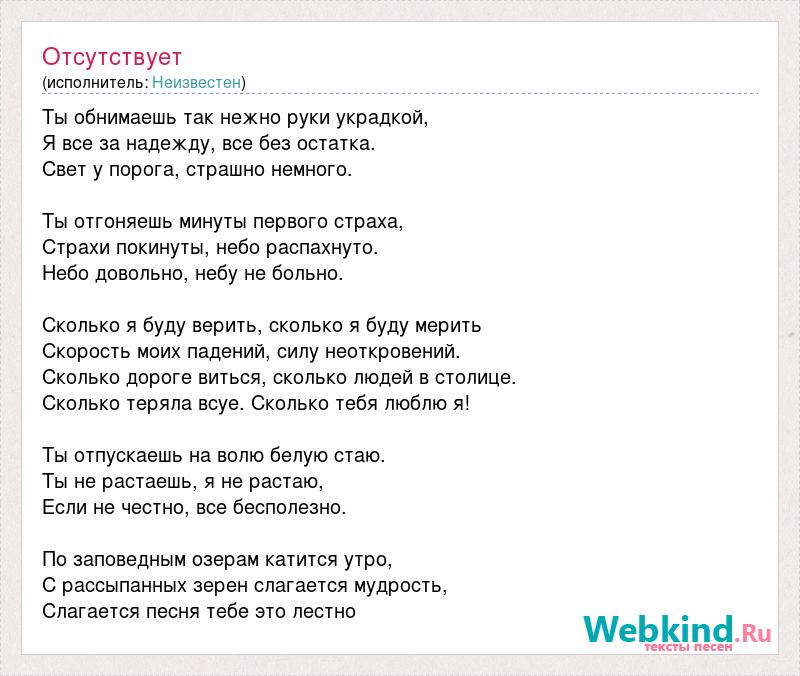 Ты обнимаешь так нежно руки украдкой, Я все за надежду, все без остатка. Свет у порога, страшно немного. Ты отгоняешь минуты первого страха, Страхи покинуты, небо распахнуто. Небо довольно, небу не больно. Сколько я буду верить, сколько я буду мерить Скорость моих падений, силу неоткровений. Сколько дороге виться, сколько людей в столице. Сколько теряла всуе. Сколько тебя люблю я! Ты отпускаешь на волю белую стаю. Ты не растаешь, я не растаю, Если не честно, все бесполезно. По заповедным озерам катится утро, С рассыпанных зерен слагается мудрость, Слагается песня тебе это лестно