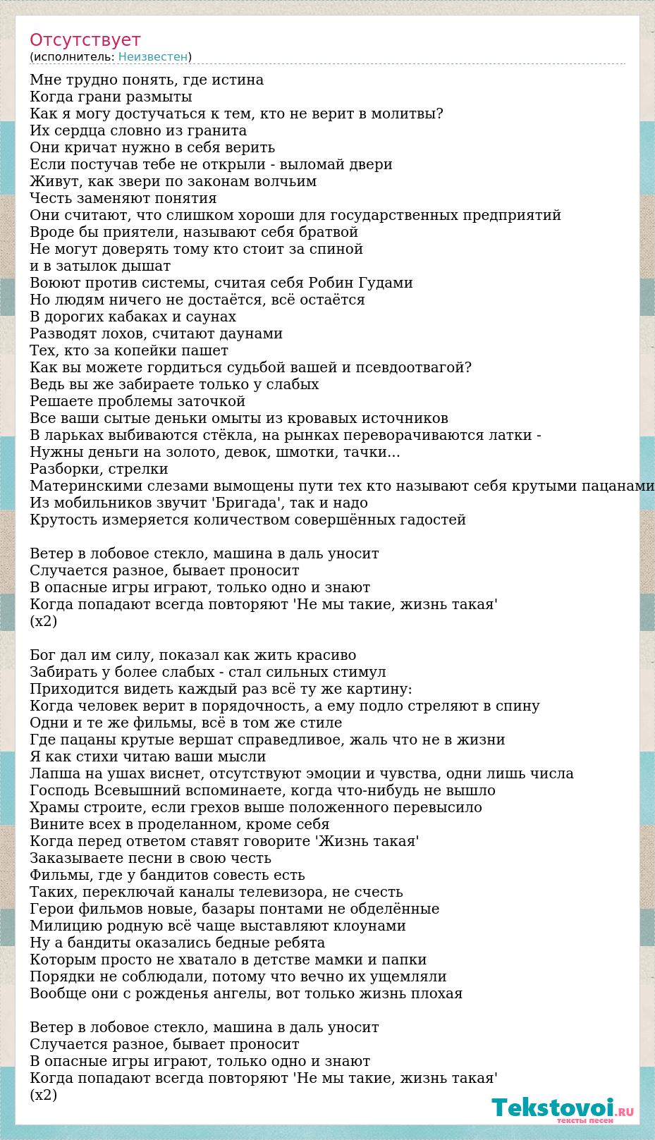 Мне трудно понять, где истина Когда грани размыты Как я могу достучаться к тем, кто не верит в молитвы? Их сердца словно из гранита Они кричат нужно в себя верить Если постучав тебе не открыли - выломай двери Живут, как звери по законам волчьим Честь заменяют понятия Они считают, что слишком хороши для государственных предприятий Вроде бы приятели, называют себя братвой Не могут доверять тому кто стоит за спиной и в затылок дышат Воюют против системы, считая себя Робин Гудами Но людям ничего не достаётся, всё остаётся В дорогих кабаках и саунах Разводят лохов, считают даунами Тех, кто за копейки пашет Как вы можете гордиться судьбой вашей и псевдоотвагой? Ведь вы же забираете только у слабых Решаете проблемы заточкой Все ваши сытые деньки омыты из кровавых источников В ларьках выбиваются стёкла, на рынках переворачиваются латки - Нужны деньги на золото, девок, шмотки, тачки... Разборки, стрелки Материнскими слезами вымощены пути тех кто называют себя крутыми пацанами Из мобильников звучит 'Бригада', так и надо Крутость измеряется количеством совершённых гадостей Ветер в лобовое стекло, машина в даль уносит Случается разное, бывает проносит В опасные игры играют, только одно и знают Когда попадают всегда повторяют 'Не мы такие, жизнь такая' (х2) Бог дал им силу, показал как жить красиво Забирать у более слабых - стал сильных стимул Приходится видеть каждый раз всё ту же картину: Когда человек верит в порядочность, а ему подло стреляют в спину Одни и те же фильмы, всё в том же стиле Где пацаны крутые вершат справедливое, жаль что не в жизни Я как стихи читаю ваши мысли Лапша на ушах виснет, отсутствуют эмоции и чувства, одни лишь числа Господь Всевышний вспоминаете, когда что-нибудь не вышло Храмы строите, если грехов выше положенного перевысило Вините всех в проделанном, кроме себя Когда перед ответом ставят говорите 'Жизнь такая' Заказываете песни в свою честь Фильмы, где у бандитов совесть есть Таких, переключай каналы телевизора, не счесть Герои фильмов новые, базары понтами не обделённые Милицию родную всё чаще выставляют клоунами Ну а бандиты оказались бедные ребята Которым просто не хватало в детстве мамки и папки Порядки не соблюдали, потому что вечно их ущемляли Вообще они с рожденья ангелы, вот только жизнь плохая Ветер в лобовое стекло, машина в даль уносит Случается разное, бывает проносит В опасные игры играют, только одно и знают Когда попадают всегда повторяют 'Не мы такие, жизнь такая' (х2)
