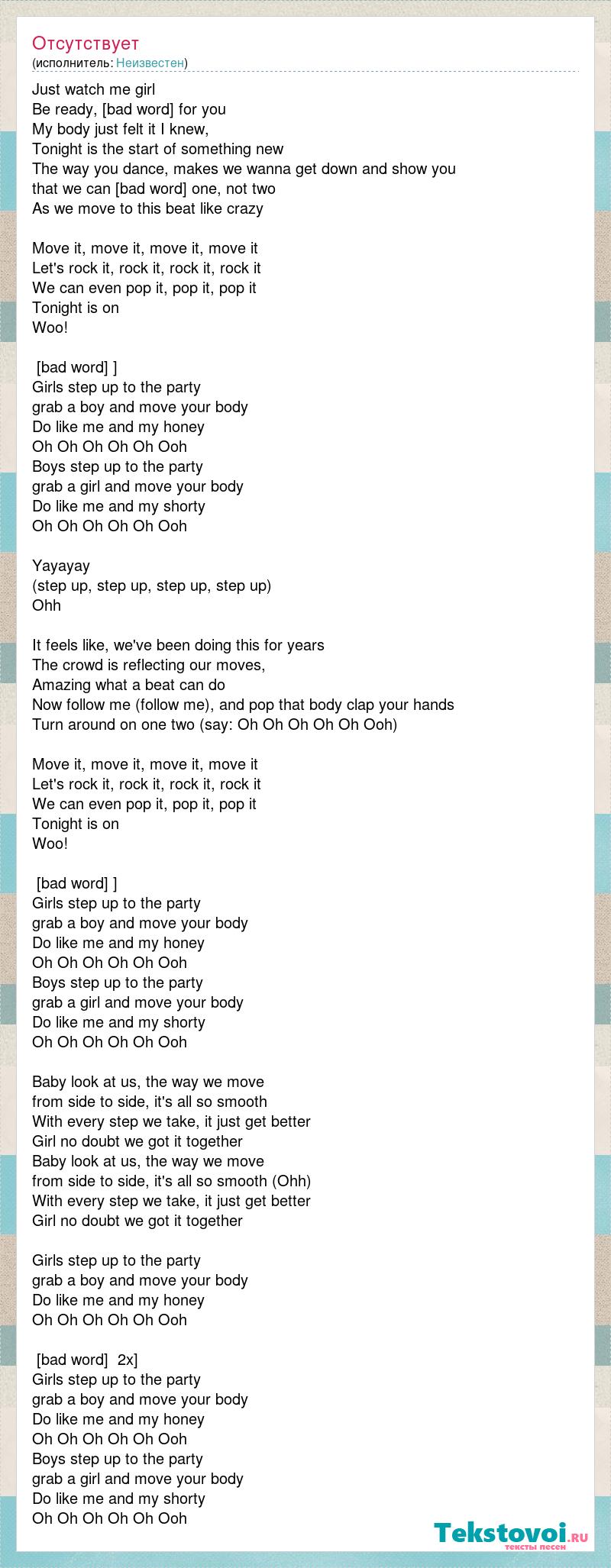 Just watch me girl Be ready, [bad word] for you My body just felt it I knew, Tonight is the start of something new The way you dance, makes we wanna get down and show you that we can [bad word] one, not two As we move to this beat like crazy Move it, move it, move it, move it Let's rock it, rock it, rock it, rock it We can even pop it, pop it, pop it Tonight is on Woo! [bad word] ] Girls step up to the party grab a boy and move your body Do like me and my honey Oh Oh Oh Oh Oh Ooh Boys step up to the party grab a girl and move your body Do like me and my shorty Oh Oh Oh Oh Oh Ooh Yayayay (step up, step up, step up, step up) Ohh It feels like, we've been doing this for years The crowd is reflecting our moves, Amazing what a beat can do Now follow me (follow me), and pop that body clap your hands Turn around on one two (say: Oh Oh Oh Oh Oh Ooh) Move it, move it, move it, move it Let's rock it, rock it, rock it, rock it We can even pop it, pop it, pop it Tonight is on Woo! [bad word] ] Girls step up to the party grab a boy and move your body Do like me and my honey Oh Oh Oh Oh Oh Ooh Boys step up to the party grab a girl and move your body Do like me and my shorty Oh Oh Oh Oh Oh Ooh Baby look at us, the way we move from side to side, it's all so smooth With every step we take, it just get better Girl no doubt we got it together Baby look at us, the way we move from side to side, it's all so smooth (Ohh) With every step we take, it just get better Girl no doubt we got it together Girls step up to the party grab a boy and move your body Do like me and my honey Oh Oh Oh Oh Oh Ooh [bad word] 2x] Girls step up to the party grab a boy and move your body Do like me and my honey Oh Oh Oh Oh Oh Ooh Boys step up to the party grab a girl and move your body Do like me and my shorty Oh Oh Oh Oh Oh Ooh