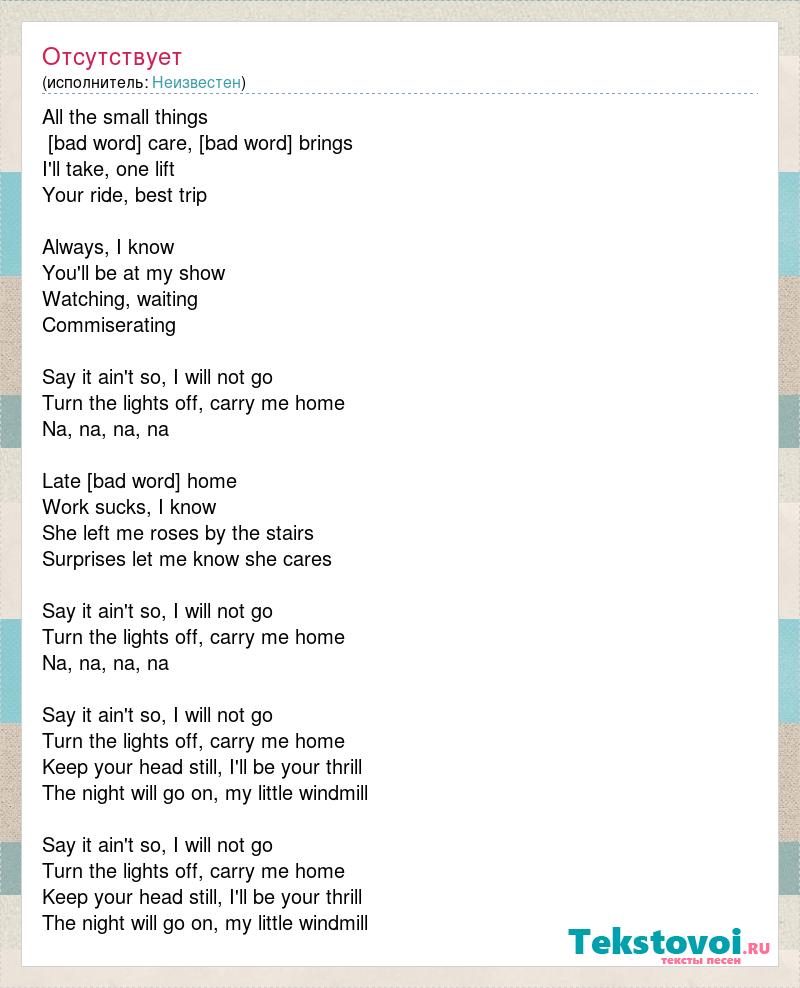 All the small things [bad word] care, [bad word] brings I'll take, one lift Your ride, best trip Always, I know You'll be at my show Watching, waiting Сommiserating Say it ain't so, I will not go Turn the lights off, carry me home Na, na, na, na Late [bad word] home Work sucks, I know She left me roses by the stairs Surprises let me know she cares Say it ain't so, I will not go Turn the lights off, carry me home Na, na, na, na Say it ain't so, I will not go Turn the lights off, carry me home Keep your head still, I'll be your thrill The night will go on, my little windmill Say it ain't so, I will not go Turn the lights off, carry me home Keep your head still, I'll be your thrill The night will go on, my little windmill