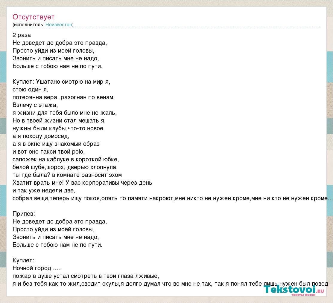 2 раза Не доведет до добра это правда, Просто уйди из моей головы, Звонить и писать мне не надо, Больше с тобою нам не по пути. Куплет: Ушатано смотрю на мир я, стою один я, потерянна вера, разогнан по венам, Взлечу с этажа, я жизни для тебя было мне не жаль, Но в твоей жизни стал мешать я, нужны были клубы,что-то новое. а я походу домосед, а я в окне ищу знакомый образ и вот оно такси твой polo, сапожек на каблуке в короткой юбке, белой шубе,шорох, дверью хлопнула, ты где была? в комнате разносит эхом Хватит врать мне! У вас корпоративы через день и так уже недели две, собрал вещи,теперь ищу покоя,опять по памяти накроют,мне никто не нужен кроме,мне ни кто не нужен кроме... Припев: Не доведет до добра это правда, Просто уйди из моей головы, Звонить и писать мне не надо, Больше с тобою нам не по пути. Куплет: Ночной город ..... пожар в душе устал смотреть в твои глаза лживые, я и без тебя как то жил,сводит скулы,я долго думал что во мне не так, так я понял тебе лишь нужен был повод