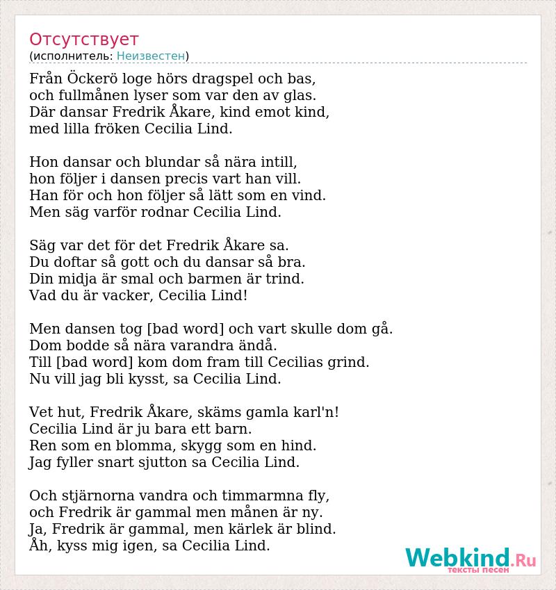 Från Öckerö loge hörs dragspel och bas, och fullmånen lyser som var den av glas. Där dansar Fredrik Åkare, kind emot kind, med lilla fröken Cecilia Lind. Hon dansar och blundar så nära intill, hon följer i dansen precis vart han vill. Han för och hon följer så lätt som en vind. Men säg varför rodnar Cecilia Lind. Säg var det för det Fredrik Åkare sa. Du doftar så gott och du dansar så bra. Din midja är smal och barmen är trind. Vad du är vacker, Cecilia Lind! Men dansen tog [bad word] och vart skulle dom gå. Dom bodde så nära varandra ändå. Till [bad word] kom dom fram till Cecilias grind. Nu vill jag bli kysst, sa Cecilia Lind. Vet hut, Fredrik Åkare, skäms gamla karl'n! Cecilia Lind är ju bara ett barn. Ren som en blomma, skygg som en hind. Jag fyller snart sjutton sa Cecilia Lind. Och stjärnorna vandra och timmarmna fly, och Fredrik är gammal men månen är ny. Ja, Fredrik är gammal, men kärlek är blind. Åh, kyss mig igen, sa Cecilia Lind.