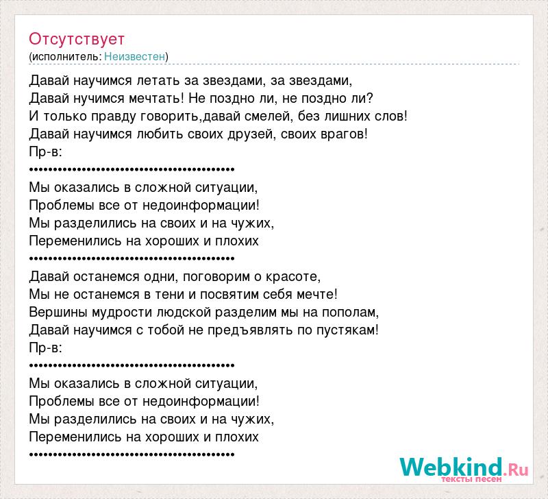 Давай научимся летать за звездами, за звездами, Давай нучимся мечтать! Не поздно ли, не поздно ли? И только правду говорить,давай смелей, без лишних слов! Давай научимся любить своих друзей, своих врагов! Пр-в: ••••••••••••••••••••••••••••••••••••••••••• Мы оказались в сложной ситуации, Проблемы все от недоинформации! Мы разделились на своих и на чужих, Переменились на хороших и плохих ••••••••••••••••••••••••••••••••••••••••••• Давай останемся одни, поговорим о красоте, Мы не останемся в тени и посвятим себя мечте! Вершины мудрости людской разделим мы на пополам, Давай научимся с тобой не предъявлять по пустякам! Пр-в: ••••••••••••••••••••••••••••••••••••••••••• Мы оказались в сложной ситуации, Проблемы все от недоинформации! Мы разделились на своих и на чужих, Переменились на хороших и плохих •••••••••••••••••••••••••••••••••••••••••••