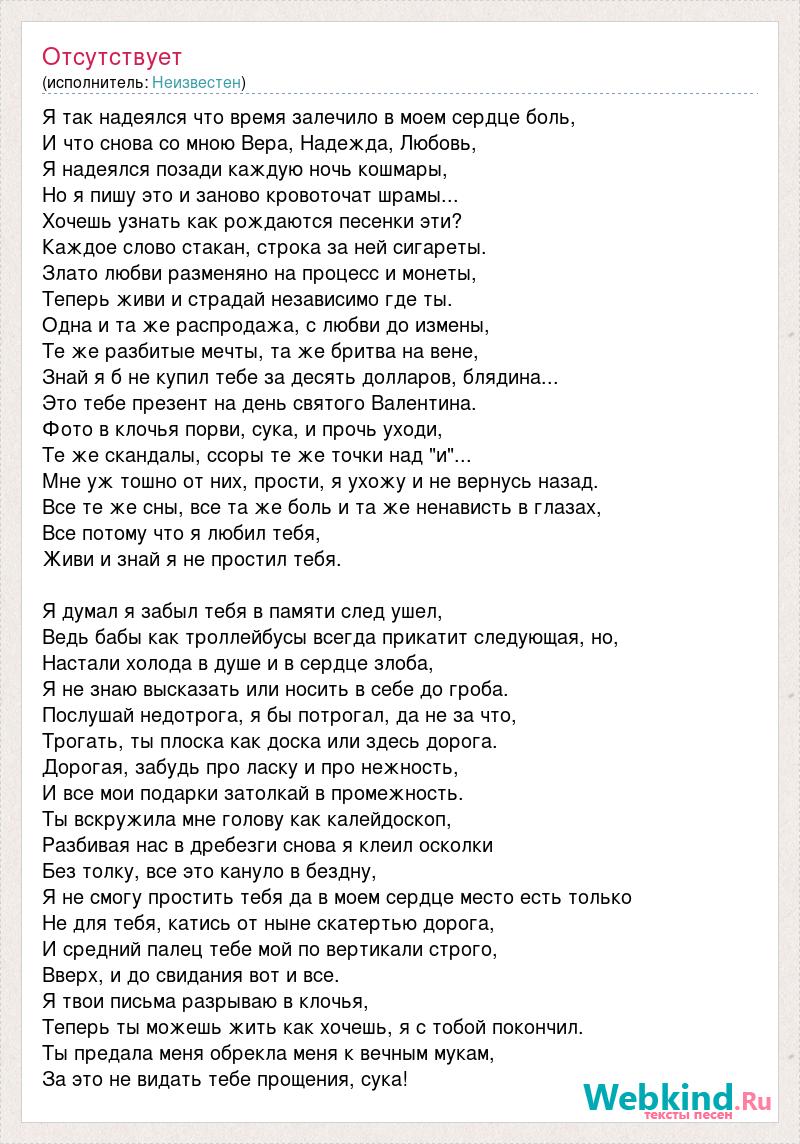Я так надеялся что время залечило в моем сердце боль, И что снова со мною Вера, Надежда, Любовь, Я надеялся позади каждую ночь кошмары, Но я пишу это и заново кровоточат шрамы... Хочешь узнать как рождаются песенки эти? Каждое слово стакан, строка за ней сигареты. Злато любви разменяно на процесс и монеты, Теперь живи и страдай независимо где ты. Одна и та же распродажа, с любви до измены, Те же разбитые мечты, та же бритва на вене, Знай я б не купил тебе за десять долларов, блядина... Это тебе презент на день святого Валентина. Фото в клочья порви, сука, и прочь уходи, Те же скандалы, ссоры те же точки над "и"... Мне уж тошно от них, прости, я ухожу и не вернусь назад. Все те же сны, все та же боль и та же ненависть в глазах, Все потому что я любил тебя, Живи и знай я не простил тебя. Я думал я забыл тебя в памяти след ушел, Ведь бабы как троллейбусы всегда прикатит следующая, но, Настали холода в душе и в сердце злоба, Я не знаю высказать или носить в себе до гроба. Послушай недотрога, я бы потрогал, да не за что, Трогать, ты плоска как доска или здесь дорога. Дорогая, забудь про ласку и про нежность, И все мои подарки затолкай в промежность. Ты вскружила мне голову как калейдоскоп, Разбивая нас в дребезги снова я клеил осколки Без толку, все это кануло в бездну, Я не смогу простить тебя да в моем сердце место есть только Не для тебя, катись от ныне скатертью дорога, И средний палец тебе мой по вертикали строго, Вверх, и до свидания вот и все. Я твои письма разрываю в клочья, Теперь ты можешь жить как хочешь, я с тобой покончил. Ты предала меня обрекла меня к вечным мукам, За это не видать тебе прощения, сука!