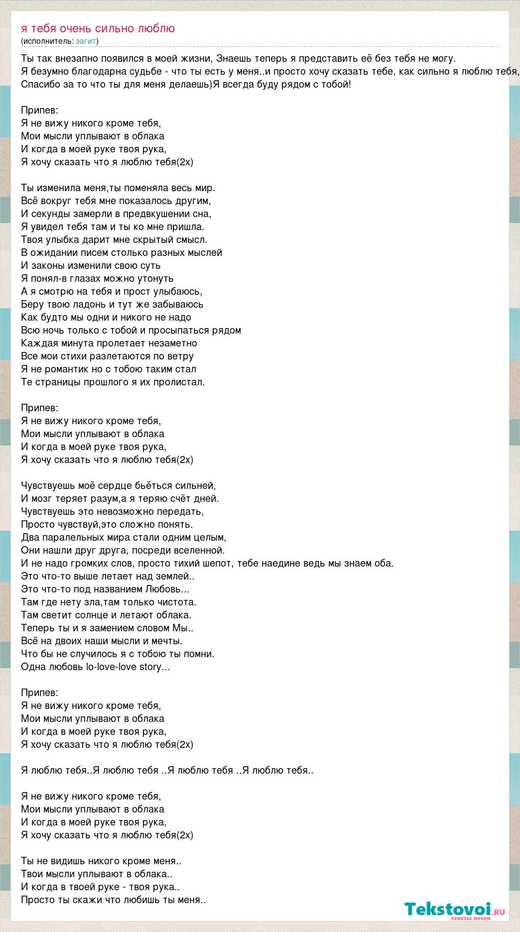 Ты так внезапно появился в моей жизни, Знаешь теперь я представить её без тебя не могу. Я безумно благодарна судьбе - что ты есть у меня..и просто хочу сказать тебе, как сильно я люблю тебя, Спасибо за то что ты для меня делаешь)Я всегда буду рядом с тобой! Припев: Я не вижу никого кроме тебя, Мои мысли уплывают в облака И когда в моей руке твоя рука, Я хочу сказать что я люблю тебя(2х) Ты изменила меня,ты поменяла весь мир. Всё вокруг тебя мне показалось другим, И секунды замерли в предвкушении сна, Я увидел тебя там и ты ко мне пришла. Твоя улыбка дарит мне скрытый смысл. В ожидании писем столько разных мыслей И законы изменили свою суть Я понял-в глазах можно утонуть А я смотрю на тебя и прост улыбаюсь, Беру твою ладонь и тут же забываюсь Как будто мы одни и никого не надо Всю ночь только с тобой и просыпаться рядом Каждая минута пролетает незаметно Все мои стихи разлетаются по ветру Я не романтик но с тобою таким стал Те страницы прошлого я их пролистал. Припев: Я не вижу никого кроме тебя, Мои мысли уплывают в облака И когда в моей руке твоя рука, Я хочу сказать что я люблю тебя(2х) Чувствуешь моё сердце бьёться сильней, И мозг теряет разум,а я теряю счёт дней. Чувствуешь это невозможно передать, Просто чувствуй,это сложно понять. Два паралельных мира стали одним целым, Они нашли друг друга, посреди вселенной. И не надо громких слов, просто тихий шепот, тебе наедине ведь мы знаем оба. Это что-то выше летает над землей.. Это что-то под названием Любовь... Там где нету зла,там только чистота. Там светит солнце и летают облака. Теперь ты и я замением словом Мы.. Всё на двоих наши мысли и мечты. Что бы не случилось я с тобою ты помни. Одна любовь lo-love-love story... Припев: Я не вижу никого кроме тебя, Мои мысли уплывают в облака И когда в моей руке твоя рука, Я хочу сказать что я люблю тебя(2х) Я люблю тебя..Я люблю тебя ..Я люблю тебя ..Я люблю тебя.. Я не вижу никого кроме тебя, Мои мысли уплывают в облака И когда в моей руке твоя рука, Я хочу сказать что я люблю тебя(2х) Ты не видишь никого кроме меня.. Твои мысли уплывают в облака.. И когда в твоей руке - твоя рука.. Просто ты скажи что любишь ты меня..