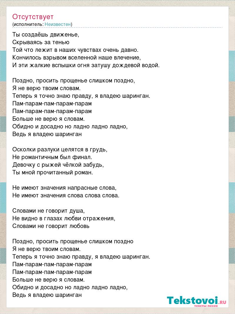 Ты создаёшь движенье, Скрываясь за тенью Той что лежит в наших чувствах очень давно. Кончилось взрывом вселенной наше влечение, И эти жалкие вспышки огня затушу дождевой водой. Поздно, просить прощенье слишком поздно, Я не верю твоим словам. Теперь я точно знаю правду, я владею шаринган. Пам-парам-пам-парам-парам Пам-парам-пам-парам-парам Больше не верю я словам. Обидно и досадно но ладно ладно ладно, Ведь я владею шаринган Осколки разлуки целятся в грудь, Не романтичным был финал. Девочку с рыжей чёлкой забудь, Ты мной прочитанный роман. Не имеют значения напрасные слова, Не имеют значения слова слова слова. Словами не говорит душа, Не видно в глазах любви отражения, Словами не говорит любовь Поздно, просить прощенье слишком поздно Я не верю твоим словам. Теперь я точно знаю правду, я владею шаринган. Пам-парам-пам-парам-парам Пам-парам-пам-парам-парам Больше не верю я словам. Обидно и досадно но ладно ладно ладно, Ведь я владею шаринган