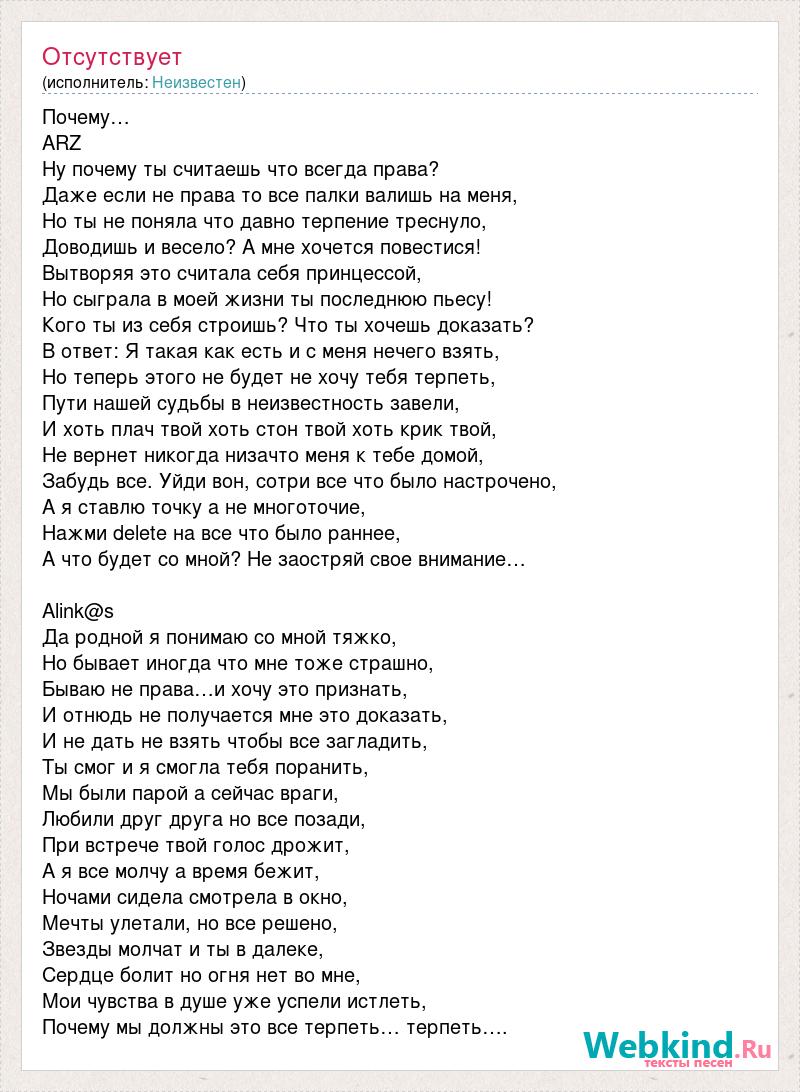 Почему… ARZ Ну почему ты считаешь что всегда права? Даже если не права то все палки валишь на меня, Но ты не поняла что давно терпение треснуло, Доводишь и весело? А мне хочется повестися! Вытворяя это считала себя принцессой, Но сыграла в моей жизни ты последнюю пьесу! Кого ты из себя строишь? Что ты хочешь доказать? В ответ: Я такая как есть и с меня нечего взять, Но теперь этого не будет не хочу тебя терпеть, Пути нашей судьбы в неизвестность завели, И хоть плач твой хоть стон твой хоть крик твой, Не вернет никогда низачто меня к тебе домой, Забудь все. Уйди вон, сотри все что было настрочено, А я ставлю точку а не многоточие, Нажми delete на все что было раннее, А что будет со мной? Не заостряй свое внимание… Alink@s Да родной я понимаю со мной тяжко, Но бывает иногда что мне тоже страшно, Бываю не права…и хочу это признать, И отнюдь не получается мне это доказать, И не дать не взять чтобы все загладить, Ты смог и я смогла тебя поранить, Мы были парой а сейчас враги, Любили друг друга но все позади, При встрече твой голос дрожит, А я все молчу а время бежит, Ночами сидела смотрела в окно, Мечты улетали, но все решено, Звезды молчат и ты в далеке, Сердце болит но огня нет во мне, Мои чувства в душе уже успели истлеть, Почему мы должны это все терпеть… терпеть….