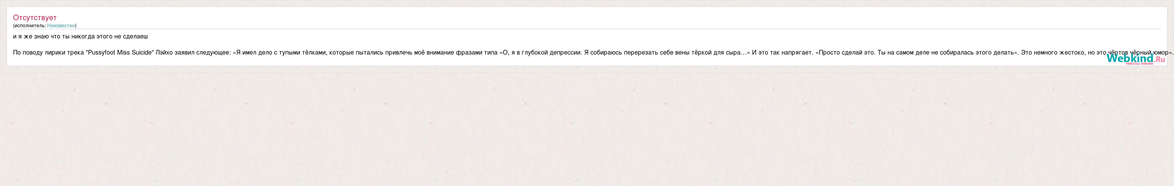 и я же знаю что ты никогда этого не сделаеш По поводу лирики трека "Pussyfoot Miss Suicide" Лэйхо заявил следующее: «Я имел дело с тупыми тёлками, которые пытались привлечь моё внимание фразами типа «О, я в глубокой депрессии. Я собираюсь перерезать себе вены тёркой для сыра…» И это так напрягает. «Просто сделай это. Ты на самом деле не собиралась этого делать». Это немного жестоко, но это чёртов чёрный юмор».