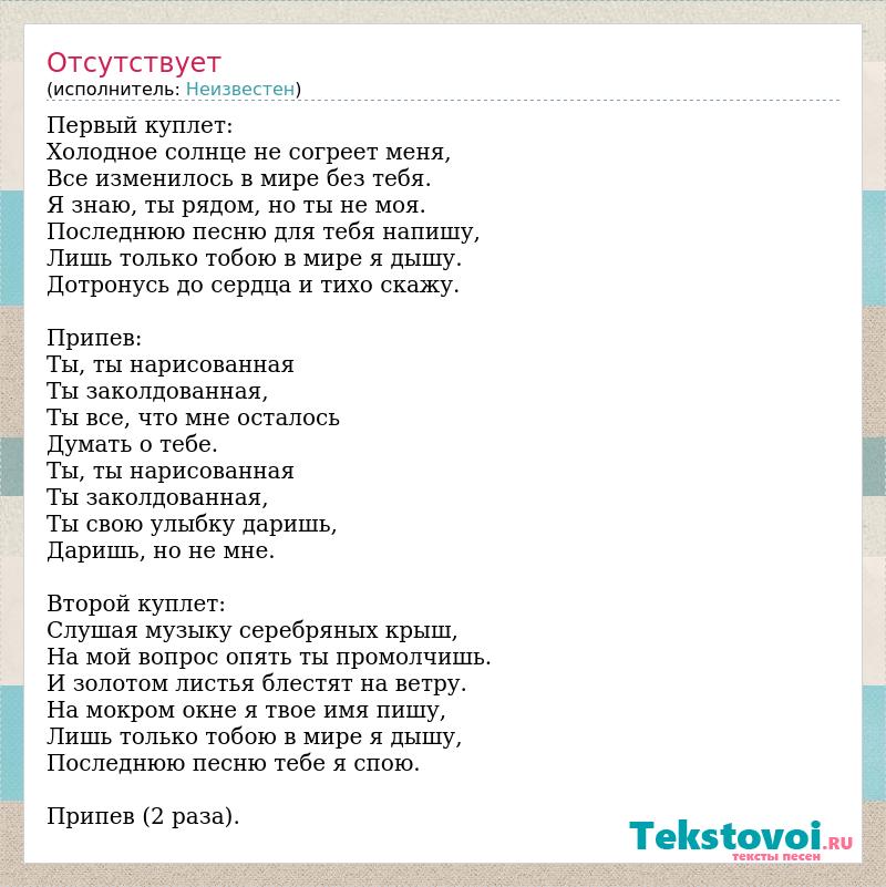 Первый куплет: Холодное солнце не согреет меня, Все изменилось в мире без тебя. Я знаю, ты рядом, но ты не моя. Последнюю песню для тебя напишу, Лишь только тобою в мире я дышу. Дотронусь до сердца и тихо скажу. Припев: Ты, ты нарисованная Ты заколдованная, Ты все, что мне осталось Думать о тебе. Ты, ты нарисованная Ты заколдованная, Ты свою улыбку даришь, Даришь, но не мне. Второй куплет: Слушая музыку серебряных крыш, На мой вопрос опять ты промолчишь. И золотом листья блестят на ветру. На мокром окне я твое имя пишу, Лишь только тобою в мире я дышу, Последнюю песню тебе я спою. Припев (2 раза).