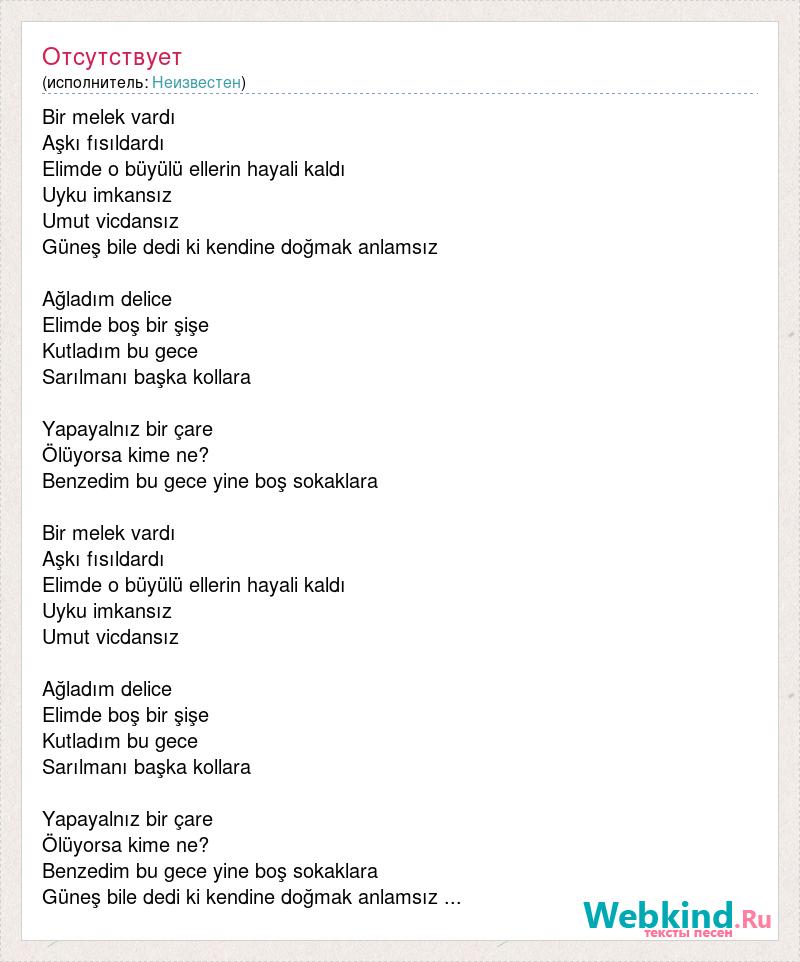 Bir melek vardı Aşkı fısıldardı Elimde o büyülü ellerin hayali kaldı Uyku imkansız Umut vicdansız Güneş bile dedi ki kendine doğmak anlamsız Ağladım delice Elimde boş bir şişe Kutladım bu gece Sarılmanı başka kollara Yapayalnız bir çare Ölüyorsa kime ne? Benzedim bu gece yine boş sokaklara Bir melek vardı Aşkı fısıldardı Elimde o büyülü ellerin hayali kaldı Uyku imkansız Umut vicdansız Ağladım delice Elimde boş bir şişe Kutladım bu gece Sarılmanı başka kollara Yapayalnız bir çare Ölüyorsa kime ne? Benzedim bu gece yine boş sokaklara Güneş bile dedi ki kendine doğmak anlamsız ...