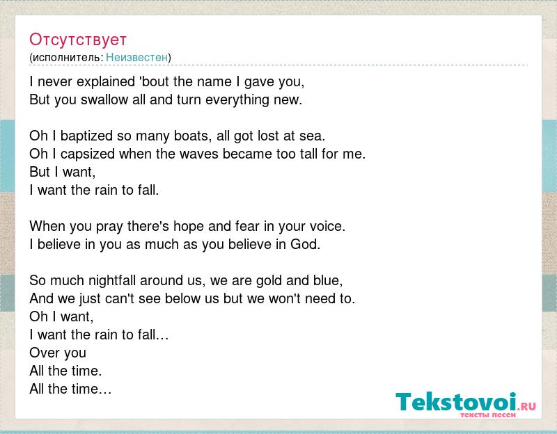 I never explained 'bout the name I gave you, But you swallow all and turn everything new. Oh I baptized so many boats, all got lost at sea. Oh I capsized when the waves became too tall for me. But I want, I want the rain to fall. When you pray there's hope and fear in your voice. I believe in you as much as you believe in God. So much nightfall around us, we are gold and blue, And we just can't see below us but we won't need to. Oh I want, I want the rain to fall… Over you All the time. All the time…