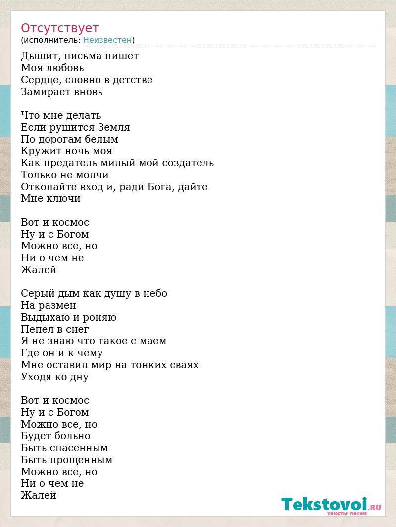 Дышит, письма пишет Моя любовь Сердце, словно в детстве Замирает вновь Что мне делать Если рушится Земля По дорогам белым Кружит ночь моя Как предатель милый мой создатель Только не молчи Откопайте вход и, ради Бога, дайте Мне ключи Вот и космос Ну и с Богом Можно все, но Ни о чем не Жалей Серый дым как душу в небо На размен Выдыхаю и роняю Пепел в снег Я не знаю что такое с маем Где он и к чему Мне оставил мир на тонких сваях Уходя ко дну Вот и космос Ну и с Богом Можно все, но Будет больно Быть спасенным Быть прощенным Можно все, но Ни о чем не Жалей