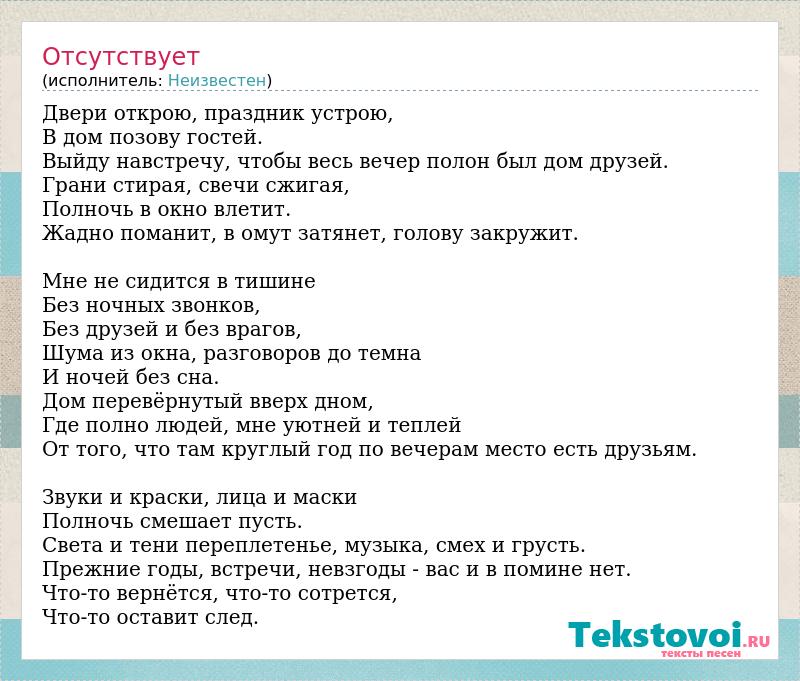 Двери открою, праздник устрою, В дом позову гостей. Выйду навстречу, чтобы весь вечер полон был дом друзей. Грани стирая, свечи сжигая, Полночь в окно влетит. Жадно поманит, в омут затянет, голову закружит. Мне не сидится в тишине Без ночных звонков, Без друзей и без врагов, Шума из окна, разговоров до темна И ночей без сна. Дом перевёрнутый вверх дном, Где полно людей, мне уютней и теплей От того, что там круглый год по вечерам место есть друзьям. Звуки и краски, лица и маски Полночь смешает пусть. Света и тени переплетенье, музыка, смех и грусть. Прежние годы, встречи, невзгоды - вас и в помине нет. Что-то вернётся, что-то сотрется, Что-то оставит след.