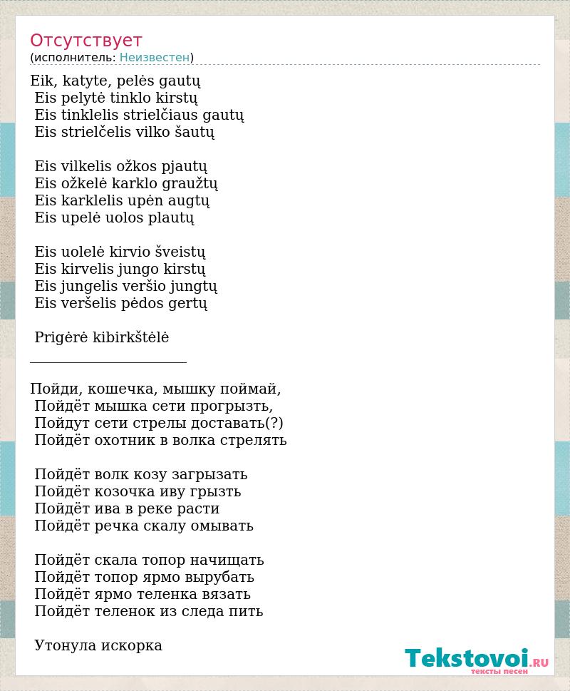 Eik, katyte, pelės gautų Eis pelytė tinklo kirstų Eis tinklelis strielčiaus gautų Eis strielčelis vilko šautų Eis vilkelis ožkos pjautų Eis ožkelė karklo graužtų Eis karklelis upėn augtų Eis upelė uolos plautų Eis uolelė kirvio šveistų Eis kirvelis jungo kirstų Eis jungelis veršio jungtų Eis veršelis pėdos gertų Prigėrė kibirkštėlė ______________________ Пойди, кошечка, мышку поймай, Пойдёт мышка сети прогрызть, Пойдут сети стрелы доставать(?) Пойдёт охотник в волка стрелять Пойдёт волк козу загрызать Пойдёт козочка иву грызть Пойдёт ива в реке расти Пойдёт речка скалу омывать Пойдёт скала топор начищать Пойдёт топор ярмо вырубать Пойдёт ярмо теленка вязать Пойдёт теленок из следа пить Утонула искорка