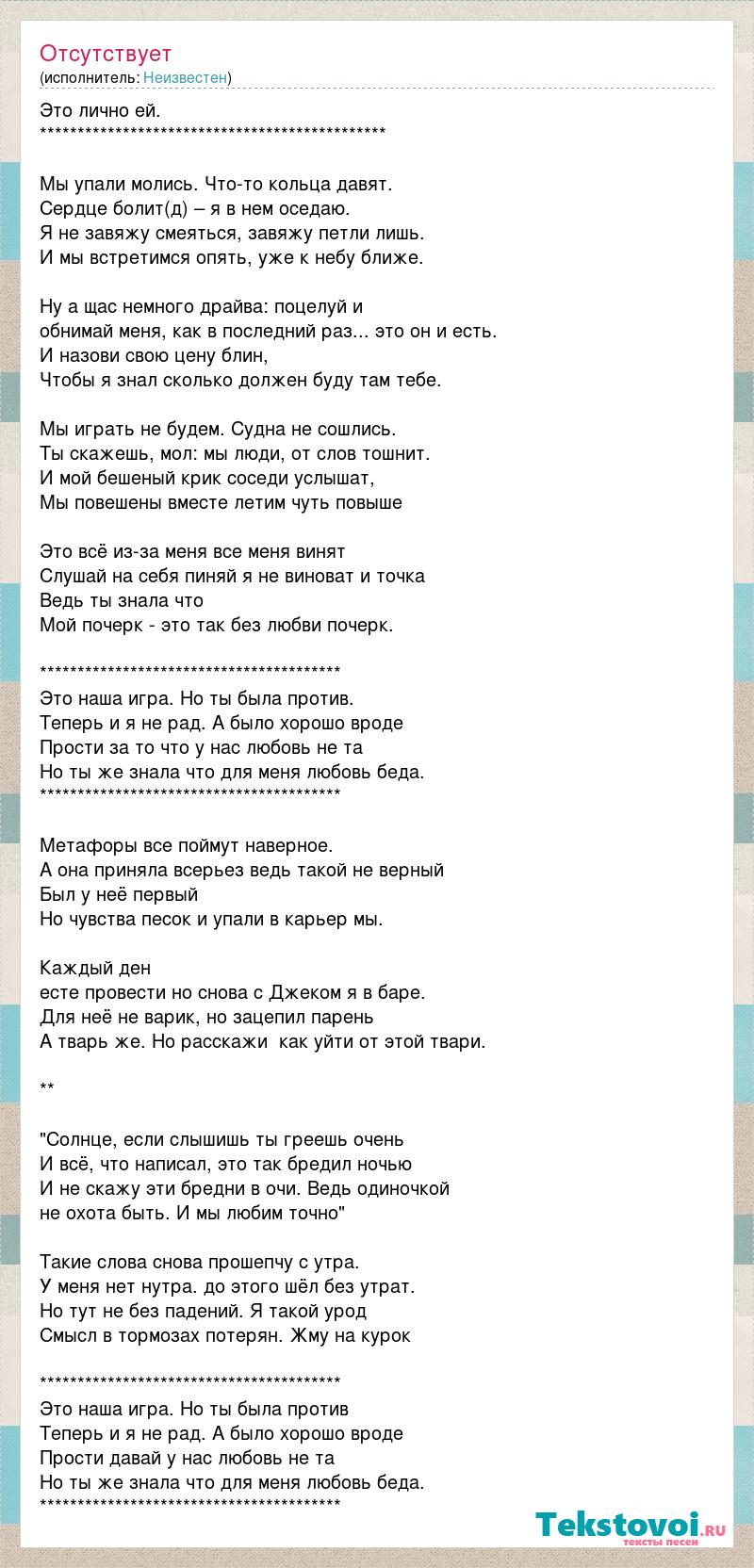 Это лично ей. ********************************************** Мы упали молись. Что-то кольца давят. Сердце болит(д) – я в нем оседаю. Я не завяжу смеяться, завяжу петли лишь. И мы встретимся опять, уже к небу ближе. Ну а щас немного драйва: пoцелуй и обнимай меня, как в последний раз... это он и есть. И назови свою цену блин, Чтобы я знал сколько должен буду там тебе. Мы играть не будем. Судна не сошлись. Ты скажешь, мол: мы люди, от слов тошнит. И мой бешеный крик соседи услышат, Мы повешены вместе летим чуть повыше Это всё из-за меня все меня винят Слушай на себя пиняй я не виноват и точка Ведь ты знала что Мой почерк - это так без любви почерк. **************************************** Это наша игра. Но ты была против. Теперь и я не рад. А было хорошо вроде Прости за то что у нас любовь не та Но ты же знала что для меня любовь беда. **************************************** Метафоры все поймут наверное. А она приняла всерьез ведь такой не верный Был у неё первый Но чувства песок и упали в карьер мы. Каждый ден есте провести но снова с Джеком я в баре. Для неё не варик, но зацепил парень А тварь же. Но расскажи как уйти от этой твари. ** "Солнце, если слышишь ты греешь очень И всё, что написал, это так бредил ночью И не скажу эти бредни в очи. Ведь одиночкой не охота быть. И мы любим точно" Такие слова снова прошепчу с утра. У меня нет нутра. до этого шёл без утрат. Но тут не без падений. Я такой урод Смысл в тормозах потерян. Жму на курок **************************************** Это наша игра. Но ты была против Теперь и я не рад. А было хорошо вроде Прости давай у нас любовь не та Но ты же знала что для меня любовь беда. ****************************************