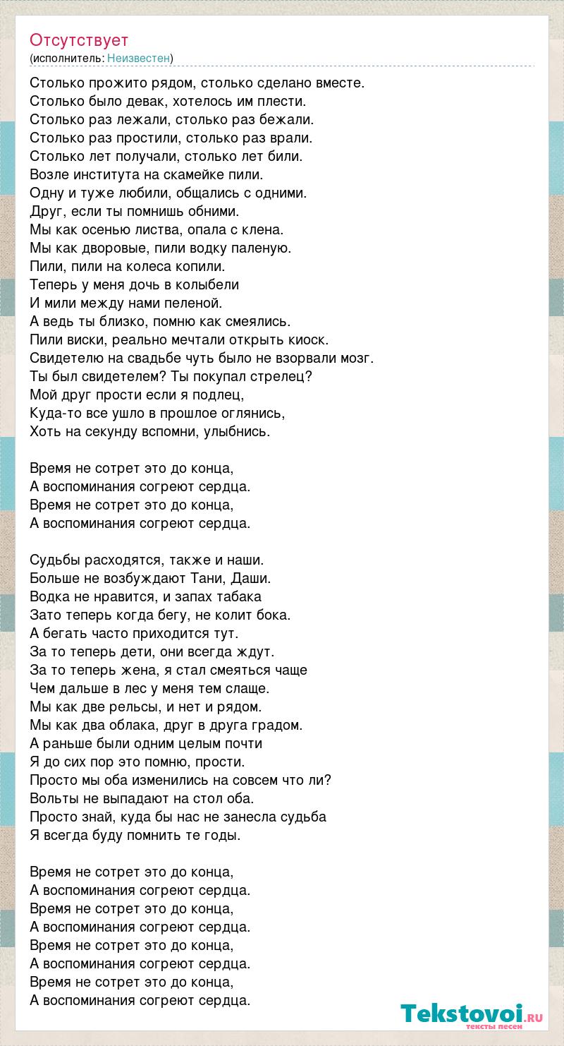 Столько прожито рядом, столько сделано вместе. Столько было девак, хотелось им плести. Столько раз лежали, столько раз бежали. Столько раз простили, столько раз врали. Столько лет получали, столько лет били. Возле института на скамейке пили. Одну и туже любили, общались с одними. Друг, если ты помнишь обними. Мы как осенью листва, опала с клена. Мы как дворовые, пили водку паленую. Пили, пили на колеса копили. Теперь у меня дочь в колыбели И мили между нами пеленой. А ведь ты близко, помню как смеялись. Пили виски, реально мечтали открыть киоск. Свидетелю на свадьбе чуть было не взорвали мозг. Ты был свидетелем? Ты покупал стрелец? Мой друг прости если я подлец, Куда-то все ушло в прошлое оглянись, Хоть на секунду вспомни, улыбнись. Время не сотрет это до конца, А воспоминания согреют сердца. Время не сотрет это до конца, А воспоминания согреют сердца. Судьбы расходятся, также и наши. Больше не возбуждают Тани, Даши. Водка не нравится, и запах табака Зато теперь когда бегу, не колит бока. А бегать часто приходится тут. За то теперь дети, они всегда ждут. За то теперь жена, я стал смеяться чаще Чем дальше в лес у меня тем слаще. Мы как две рельсы, и нет и рядом. Мы как два облака, друг в друга градом. А раньше были одним целым почти Я до сих пор это помню, прости. Просто мы оба изменились на совсем что ли? Вольты не выпадают на стол оба. Просто знай, куда бы нас не занесла судьба Я всегда буду помнить те годы. Время не сотрет это до конца, А воспоминания согреют сердца. Время не сотрет это до конца, А воспоминания согреют сердца. Время не сотрет это до конца, А воспоминания согреют сердца. Время не сотрет это до конца, А воспоминания согреют сердца.