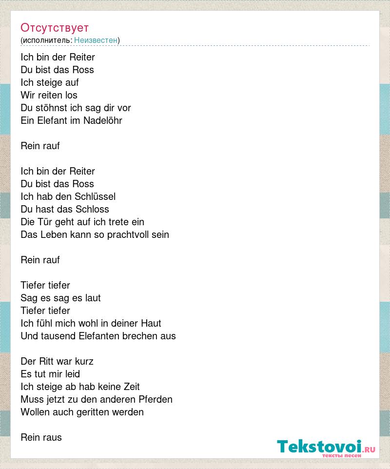 Ich bin der Reiter Du bist das Ross Ich steige auf Wir reiten los Du stöhnst ich sag dir vor Ein Elefant im Nadelöhr Rein rauf Ich bin der Reiter Du bist das Ross Ich hab den Schlüssel Du hast das Schloss Die Tür geht auf ich trete ein Das Leben kann so prachtvoll sein Rein rauf Tiefer tiefer Sag es sag es laut Tiefer tiefer Ich fühl mich wohl in deiner Haut Und tausend Elefanten brechen aus Der Ritt war kurz Es tut mir leid Ich steige ab hab keine Zeit Muss jetzt zu den anderen Pferden Wollen auch geritten werden Rein raus