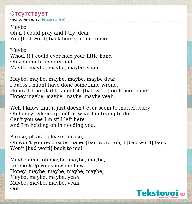 Maybe Oh if I could pray and I try, dear, You [bad word] back home, home to me. Maybe Whoa, if I could ever hold your little hand Oh you might understand. Maybe, maybe, maybe, maybe, yeah. Maybe, maybe, maybe, maybe, maybe dear I guess I might have done something wrong, Honey I'd be glad to admit it. [bad word] on home to me! Honey maybe, maybe, maybe, maybe yeah. Well I know that it just doesn't ever seem to matter, baby, Oh honey, when I go out or what I'm trying to do, Can't you see I'm still left here And I'm holding on in needing you. Please, please, please, please, Oh won't you reconsider babe. [bad word] on, I [bad word] back, Won't [bad word] back to me! Maybe dear, oh maybe, maybe, maybe, Let me help you show me how. Honey, maybe, maybe, maybe, maybe, Maybe, maybe, maybe, yeah, Maybe, maybe, maybe, yeah. Ooh!