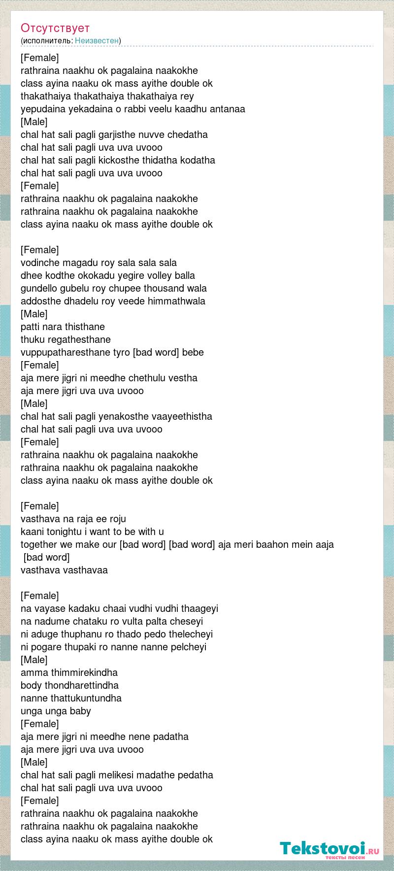 [Female] rathraina naakhu ok pagalaina naakokhe class ayina naaku ok mass ayithe double ok thakathaiya thakathaiya thakathaiya rey yepudaina yekadaina o rabbi veelu kaadhu antanaa [Male] chal hat sali pagli garjisthe nuvve chedatha chal hat sali pagli uva uva uvooo chal hat sali pagli kickosthe thidatha kodatha chal hat sali pagli uva uva uvooo [Female] rathraina naakhu ok pagalaina naakokhe rathraina naakhu ok pagalaina naakokhe class ayina naaku ok mass ayithe double ok [Female] vodinche magadu roy sala sala sala dhee kodthe okokadu yegire volley balla gundello gubelu roy chupee thousand wala addosthe dhadelu roy veede himmathwala [Male] patti nara thisthane thuku regathesthane vuppupatharesthane tyro [bad word] bebe [Female] aja mere jigri ni meedhe chethulu vestha aja mere jigri uva uva uvooo [Male] chal hat sali pagli yenakosthe vaayeethistha chal hat sali pagli uva uva uvooo [Female] rathraina naakhu ok pagalaina naakokhe rathraina naakhu ok pagalaina naakokhe class ayina naaku ok mass ayithe double ok [Female] vasthava na raja ee roju kaani tonightu i want to be with u together we make our [bad word] [bad word] aja meri baahon mein aaja [bad word] vasthava vasthavaa [Female] na vayase kadaku chaai vudhi vudhi thaageyi na nadume chataku ro vulta palta cheseyi ni aduge thuphanu ro thado pedo thelecheyi ni pogare thupaki ro nanne nanne pelcheyi [Male] amma thimmirekindha body thondharettindha nanne thattukuntundha unga unga baby [Female] aja mere jigri ni meedhe nene padatha aja mere jigri uva uva uvooo [Male] chal hat sali pagli melikesi madathe pedatha chal hat sali pagli uva uva uvooo [Female] rathraina naakhu ok pagalaina naakokhe rathraina naakhu ok pagalaina naakokhe class ayina naaku ok mass ayithe double ok