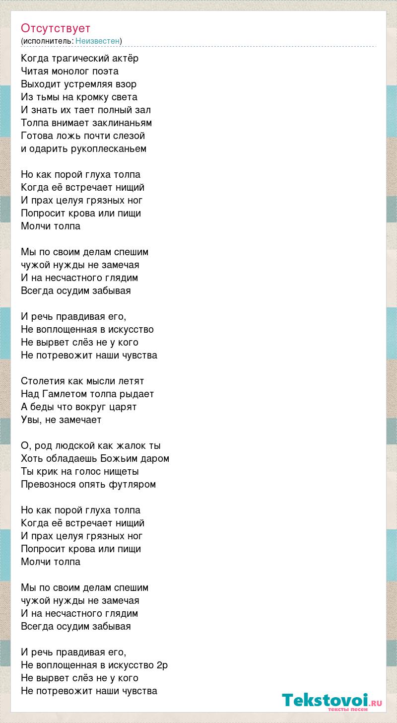 Когда трагический актёр Читая монолог поэта Выходит устремляя взор Из тьмы на кромку света И знать их тает полный зал Толпа внимает заклинаньям Готова ложь почти слезой и одарить рукоплесканьем Но как порой глуха толпа Когда её встречает нищий И прах целуя грязных ног Попросит крова или пищи Молчи толпа Мы по своим делам спешим чужой нужды не замечая И на несчастного глядим Всегда осудим забывая И речь правдивая его, Не воплощенная в искусство Не вырвет слёз не у кого Не потревожит наши чувства Столетия как мысли летят Над Гамлетом толпа рыдает А беды что вокруг царят Увы, не замечает О, род людской как жалок ты Хоть обладаешь Божьим даром Ты крик на голос нищеты Превознося опять футляром Но как порой глуха толпа Когда её встречает нищий И прах целуя грязных ног Попросит крова или пищи Молчи толпа Мы по своим делам спешим чужой нужды не замечая И на несчастного глядим Всегда осудим забывая И речь правдивая его, Не воплощенная в искусство 2р Не вырвет слёз не у кого Не потревожит наши чувства