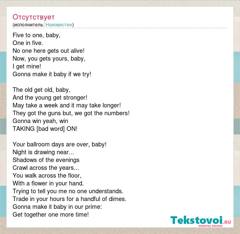 Five to one, baby, One in five. No one here gets out alive! Now, you gets yours, baby, I get mine! Gonna make it baby if we try! The old get old, baby, And the young get stronger! May take a week and it may take longer! They got the guns but, we got the numbers! Gonna win yeah, win TAKING [bad word] ON! Your ballroom days are over, baby! Night is drawing near... Shadows of the evenings Crawl across the years... You walk across the floor, With a flower in your hand. Trying to tell you me no one understands. Trade in your hours for a handful of dimes. Gonna make it baby in our prime: Get together one more time!