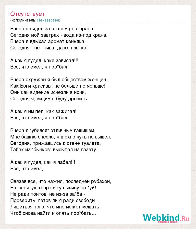 Вчера я сидел за столом ресторана, Сегодня мой завтрак - вода из-под крана. Вчера я вдыхал аромат коньяка, Сегодня - нет пива, даже глотка. А как я гудел, каке зависал!!! Всё, что имел, я про*бал! Вчера окружен я был обществом женщин, Как Боги красивы, не больше-не меньше! Они как видение исчезли в ночи, Сегодня я, видимо, буду дрочить. А как я им пел, как зажигал! Всё, что имел, я про*бал. Вчера я "убился" отличным гашишем, Мне башню снесло, я в окно чуть не вышел. Сегодня, прижавшись к стене туалета, Табак из "бычков" высыпал на газету. А как я гудел, как я лабал!!! Всё, что имел,... Связав все, что нажил, последней рубахой, В открытую форточку выкину на *уй! Не ради понтов, не из-за за*ба - Проверить, готов ли я ради свободы Лишиться того, что мне может мешать. Чтоб снова найти и опять про*бать...