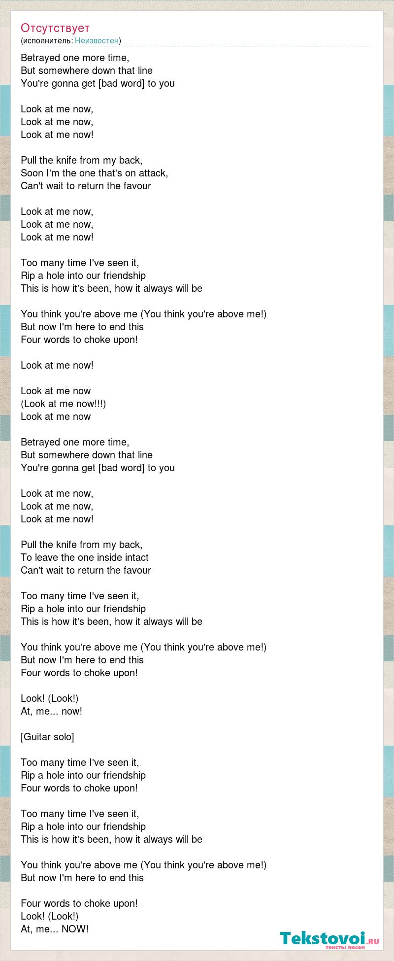 Betrayed one more time, But somewhere down that line You're gonna get [bad word] to you Look at me now, Look at me now, Look at me now! Pull the knife from my back, Soon I'm the one that's on attack, Can't wait to return the favour Look at me now, Look at me now, Look at me now! Too many time I've seen it, Rip a hole into our friendship This is how it's been, how it always will be You think you're above me (You think you're above me!) But now I'm here to end this Four words to choke upon! Look at me now! Look at me now (Look at me now!!!) Look at me now Betrayed one more time, But somewhere down that line You're gonna get [bad word] to you Look at me now, Look at me now, Look at me now! Pull the knife from my back, To leave the one inside intact Can't wait to return the favour Too many time I've seen it, Rip a hole into our friendship This is how it's been, how it always will be You think you're above me (You think you're above me!) But now I'm here to end this Four words to choke upon! Look! (Look!) At, me... now! [Guitar solo] Too many time I've seen it, Rip a hole into our friendship Four words to choke upon! Too many time I've seen it, Rip a hole into our friendship This is how it's been, how it always will be You think you're above me (You think you're above me!) But now I'm here to end this Four words to choke upon! Look! (Look!) At, me... NOW!